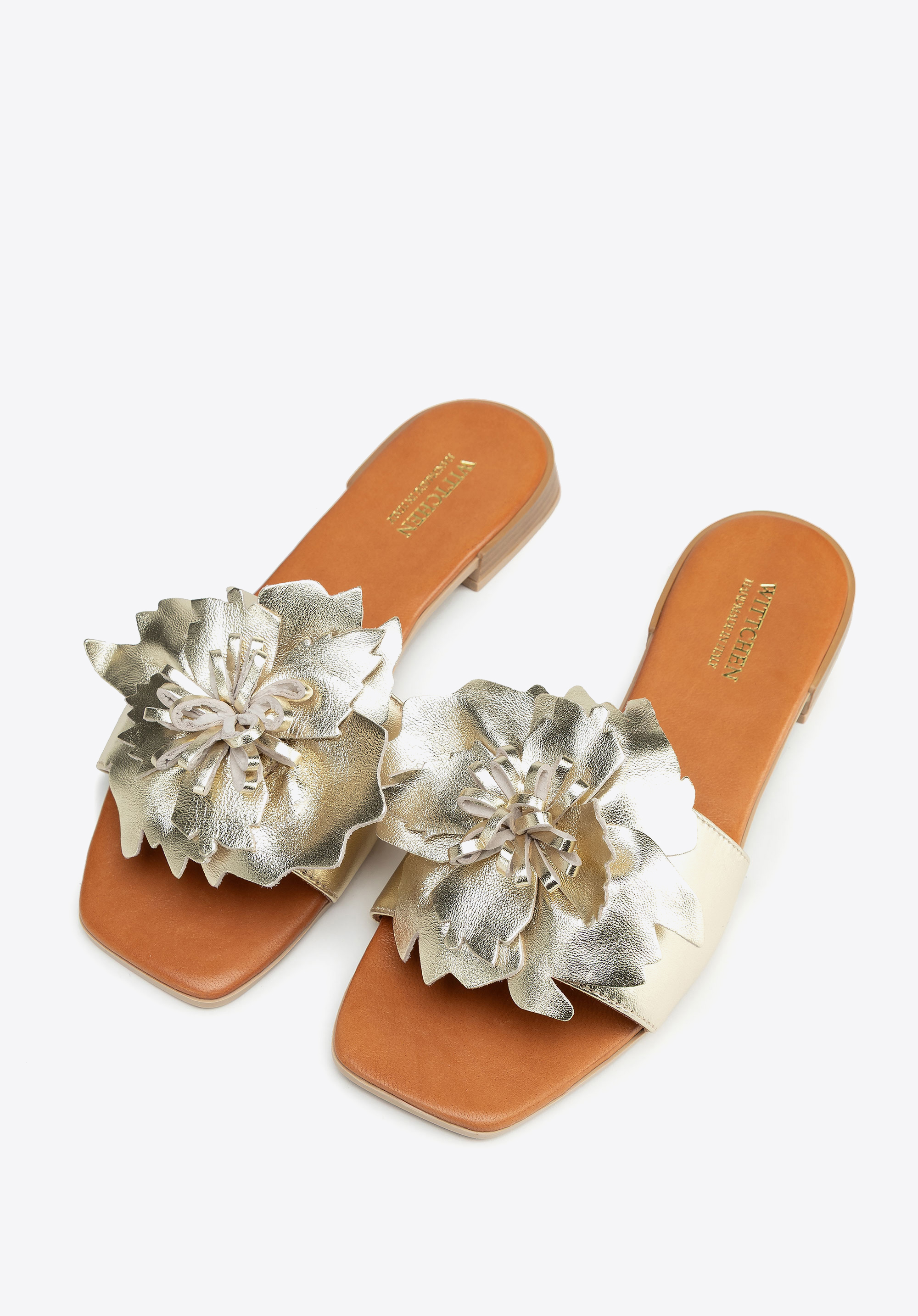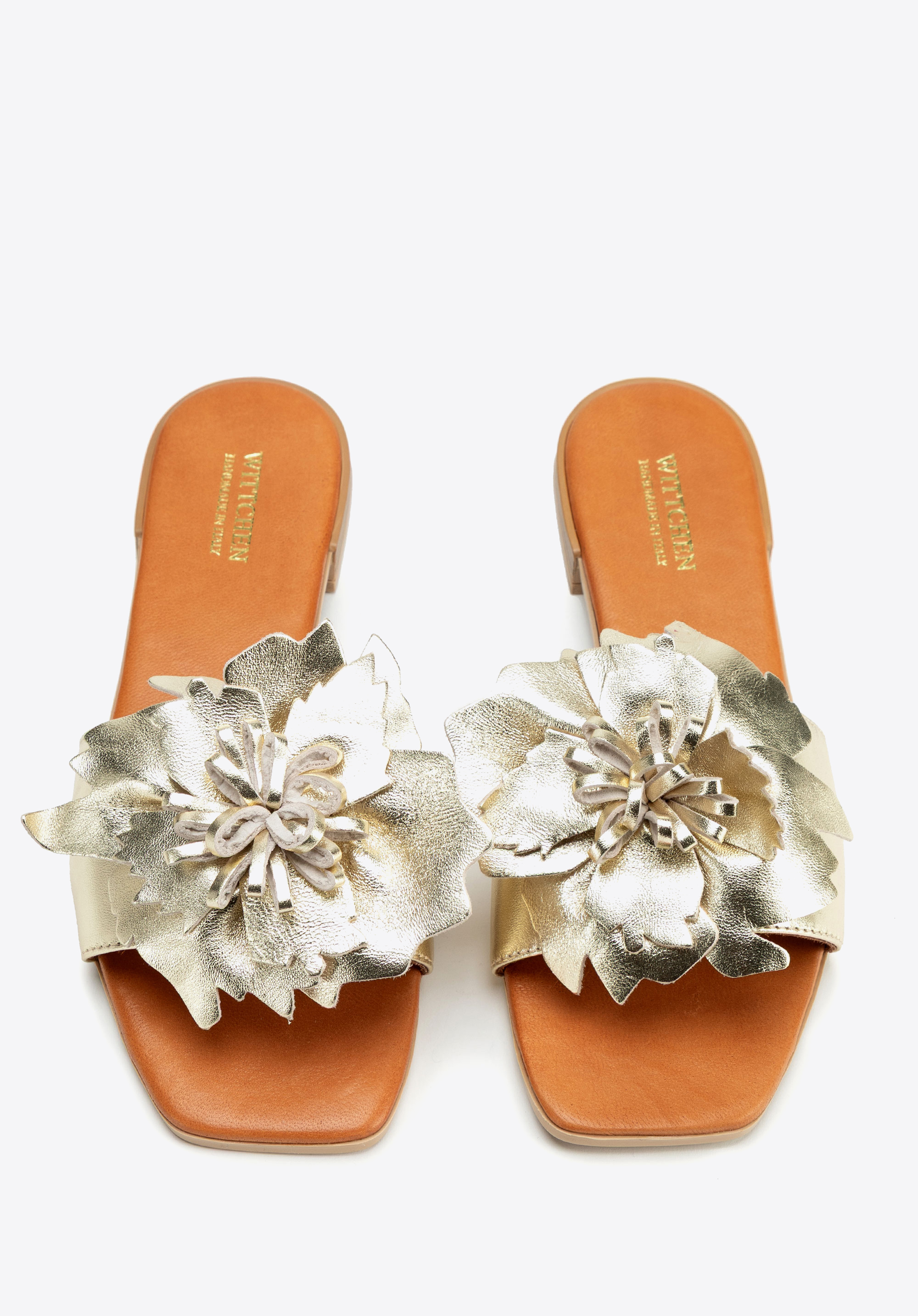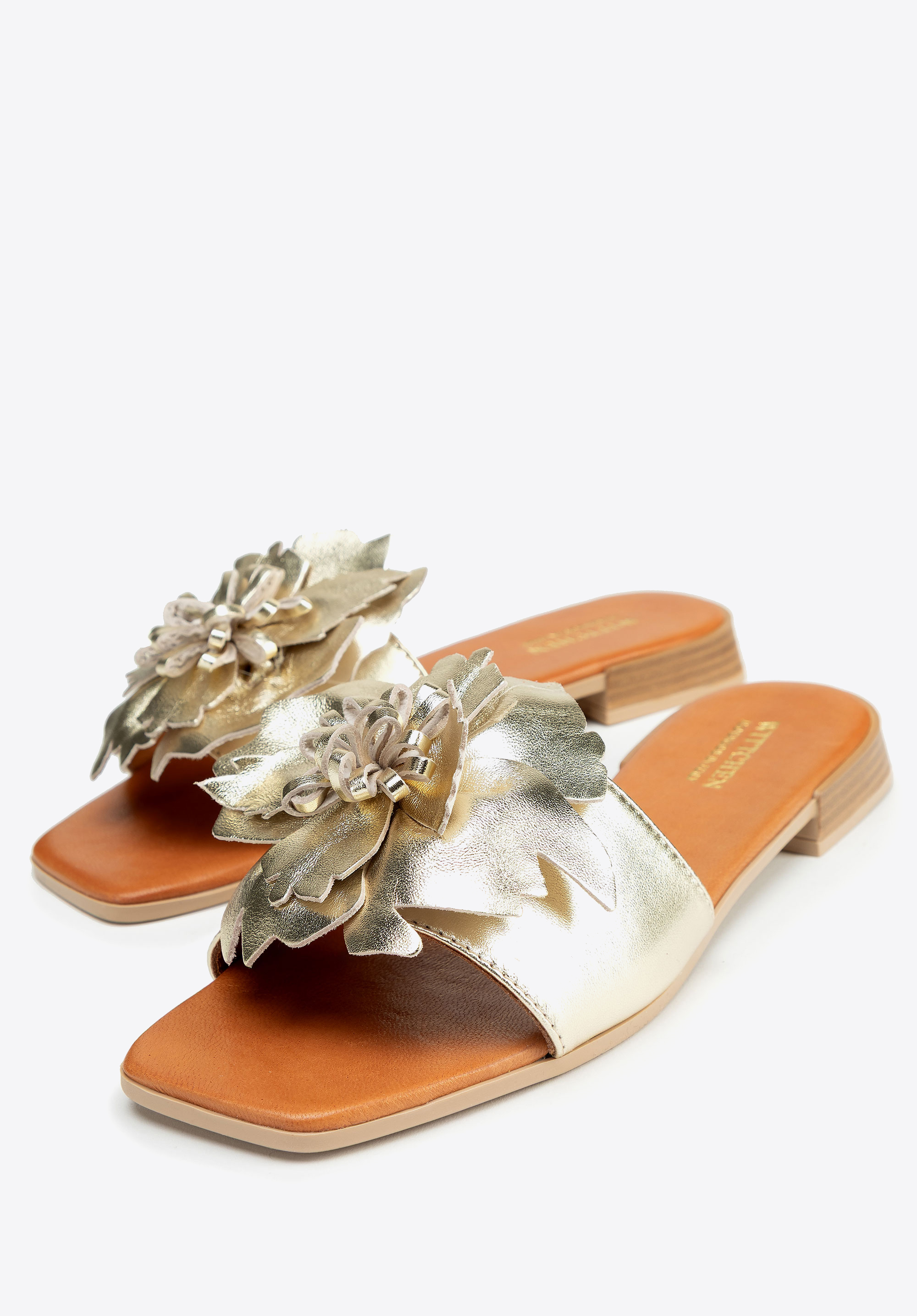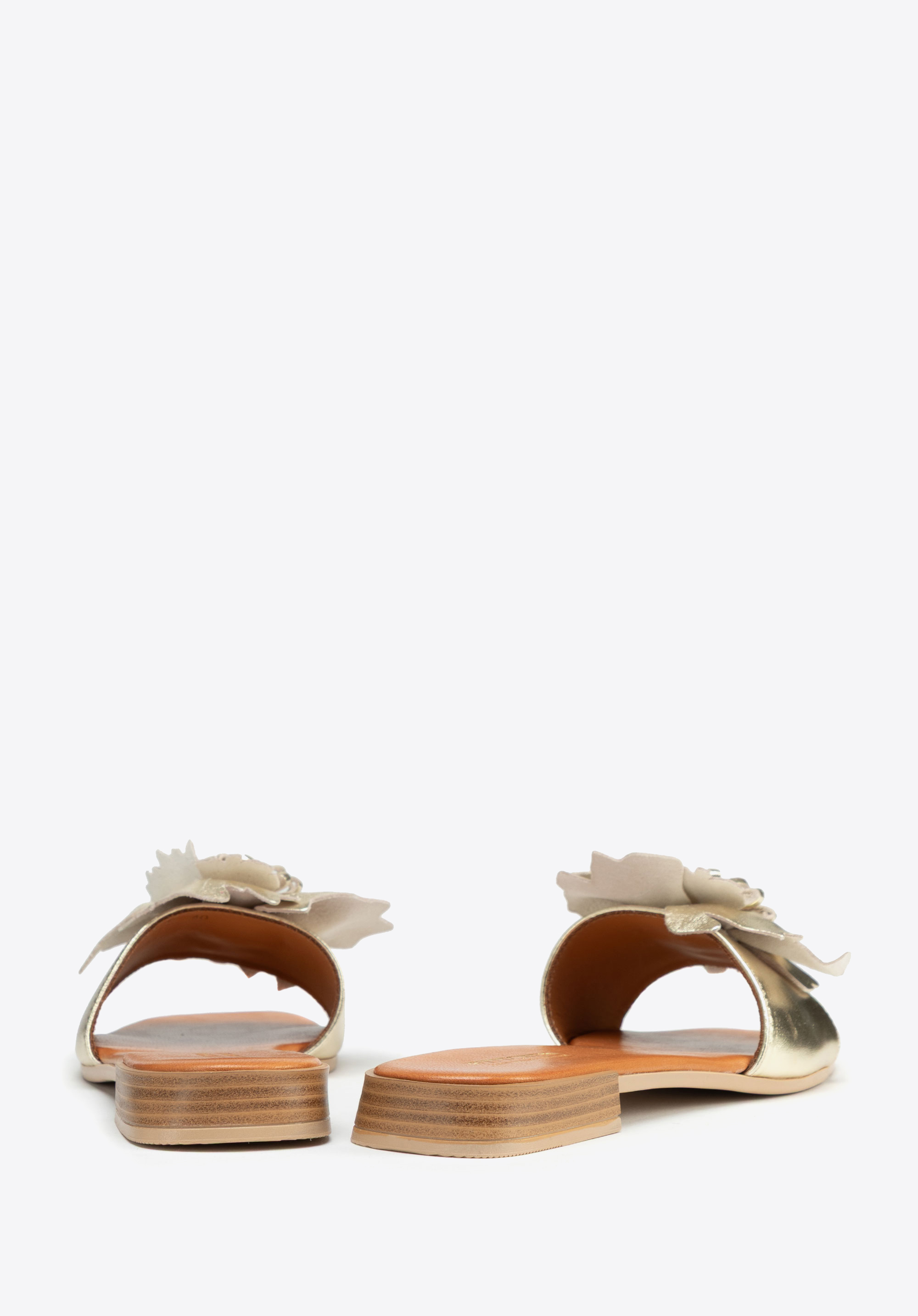 Жіночі шкіряні шльопанці з декоративними квітами золоті