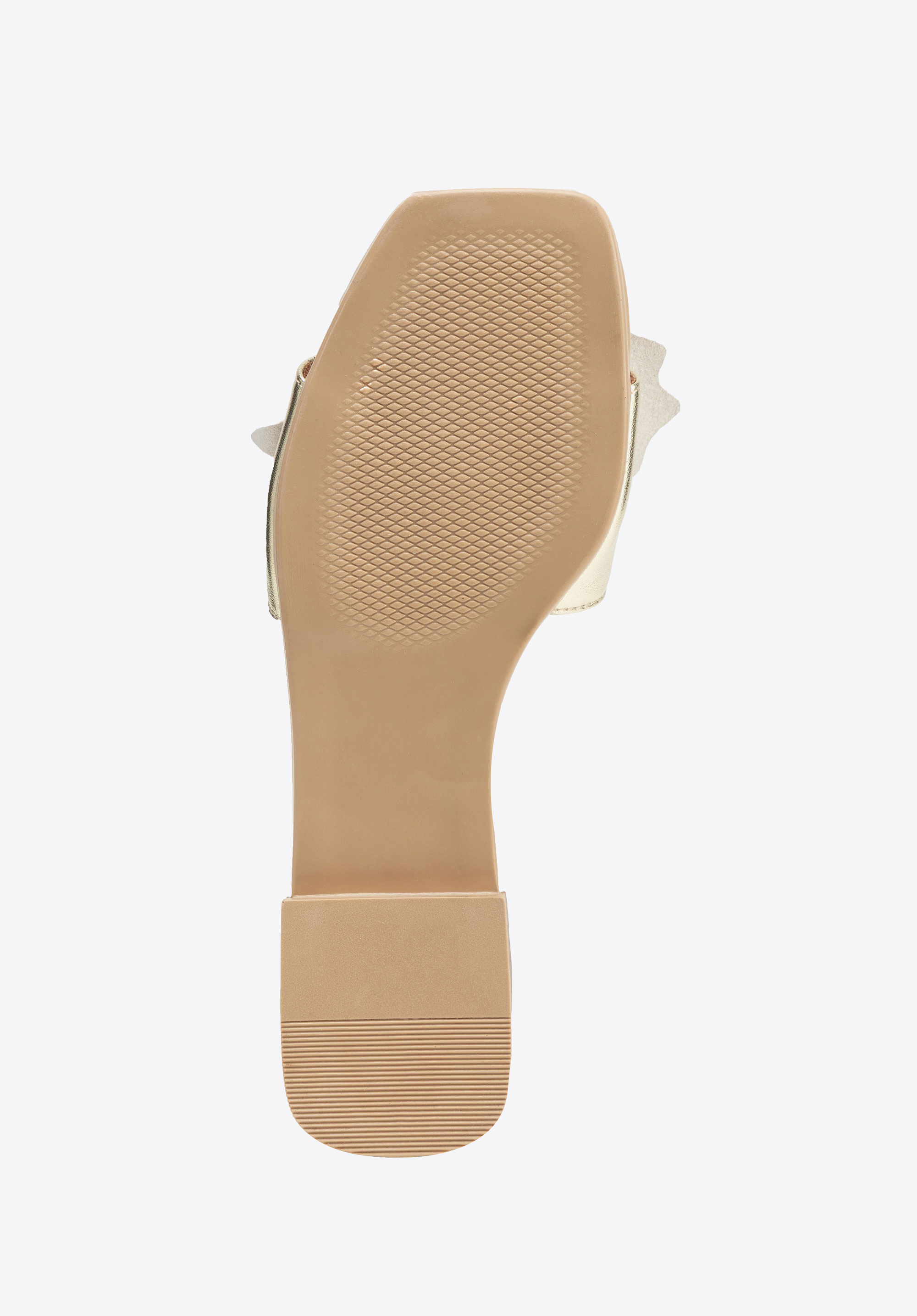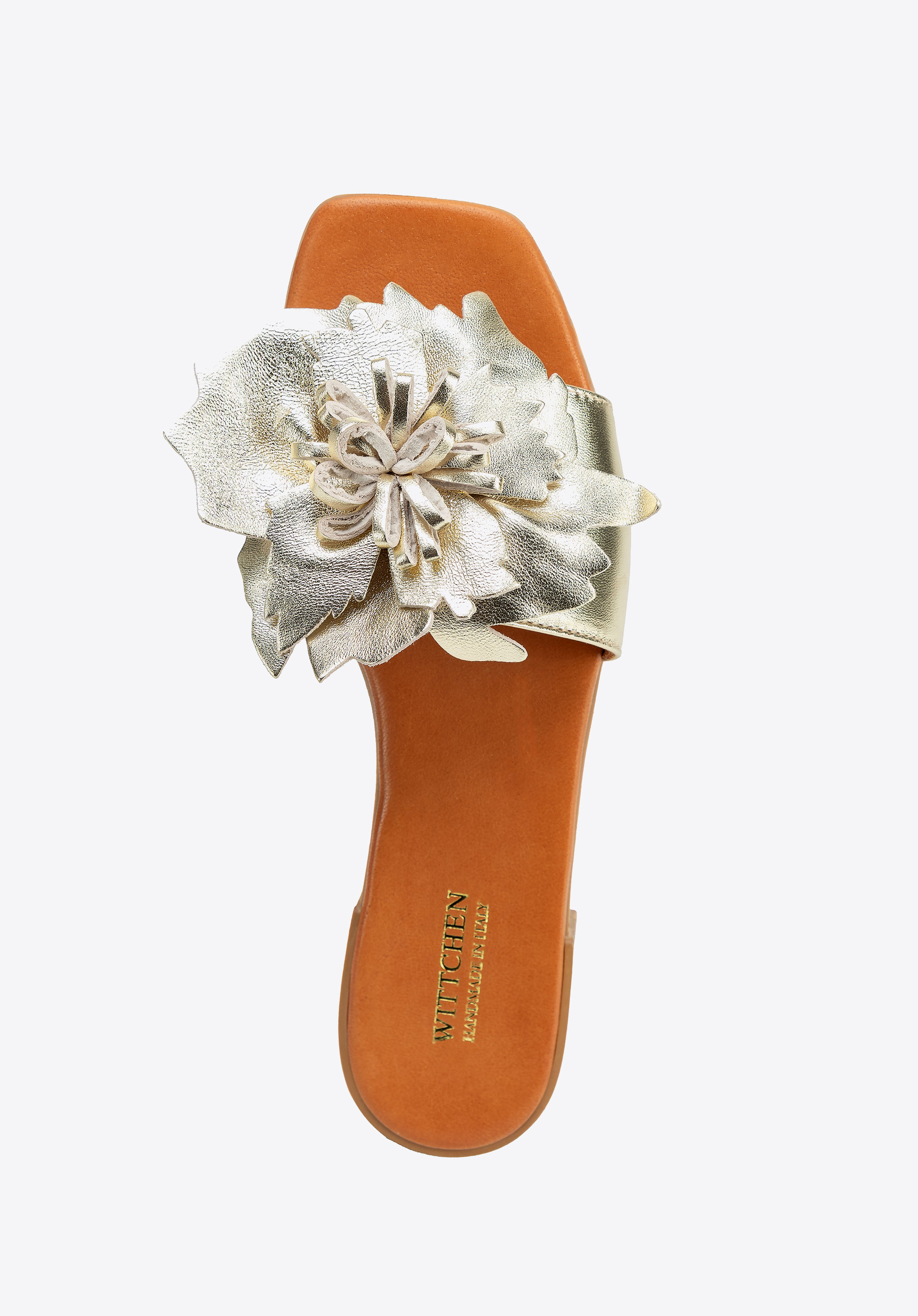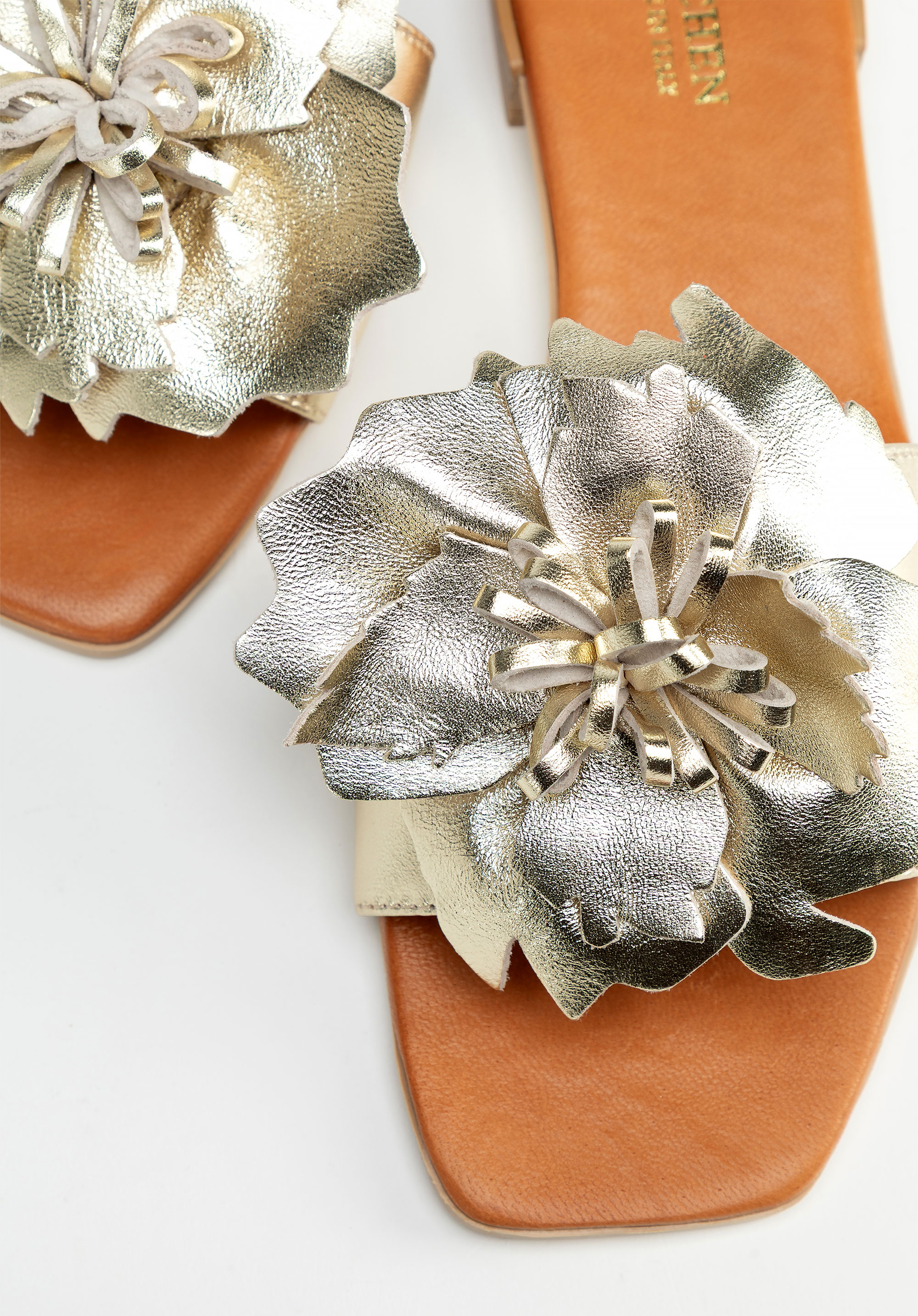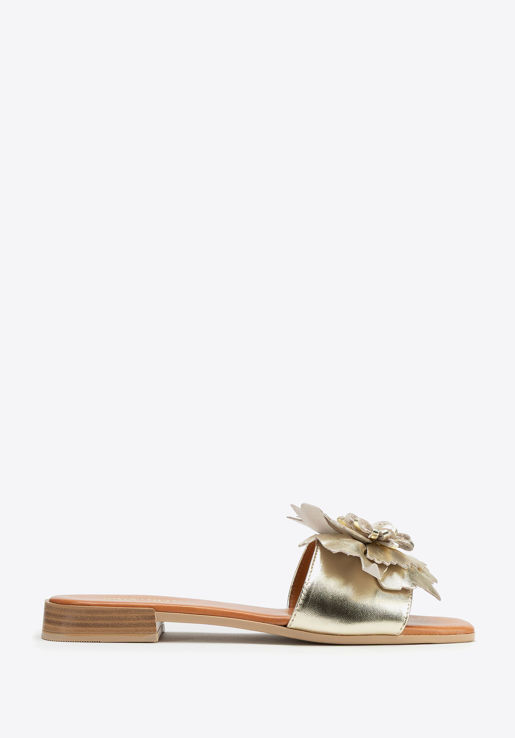 Жіночі шкіряні шльопанці з декоративними квітами золоті