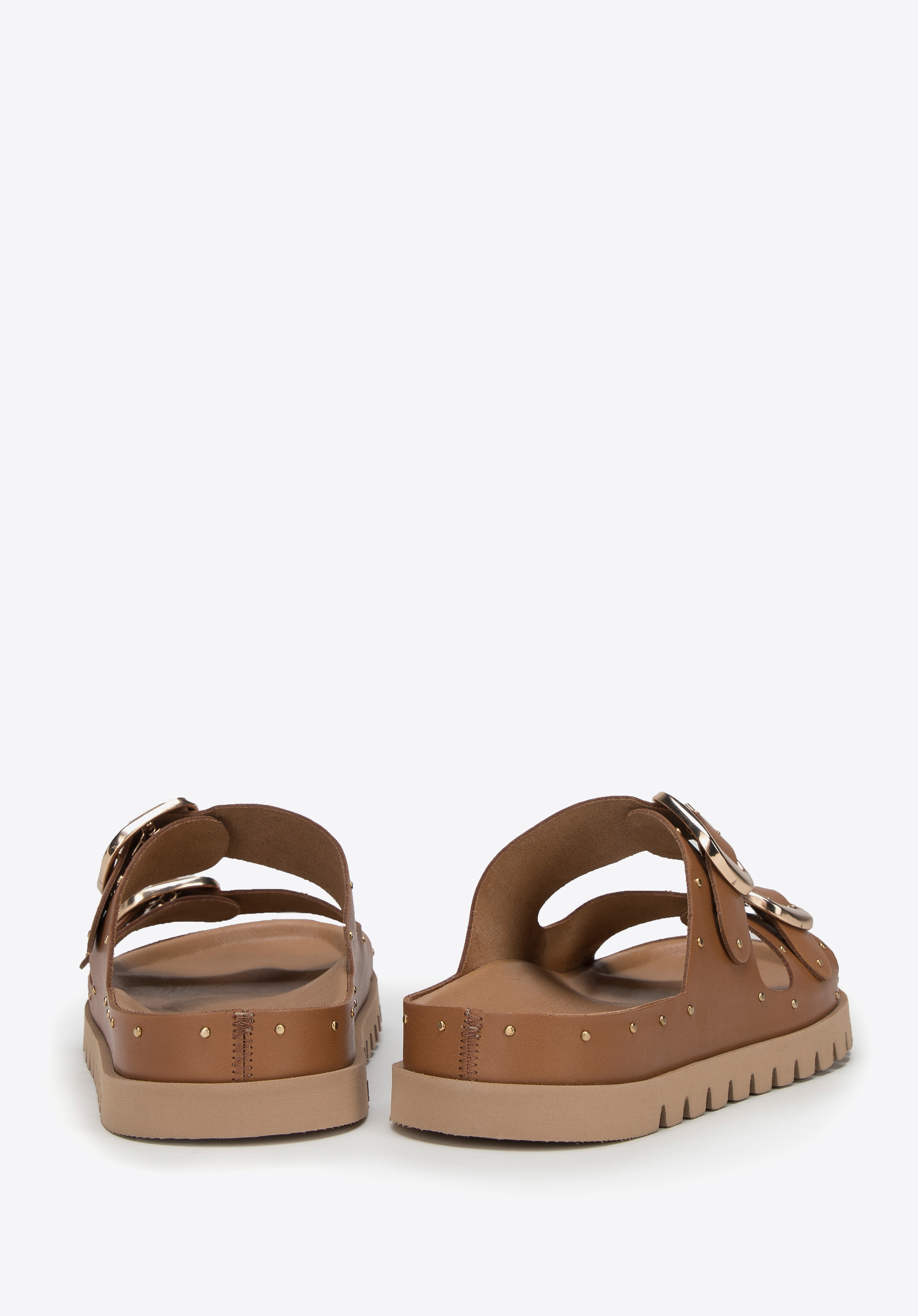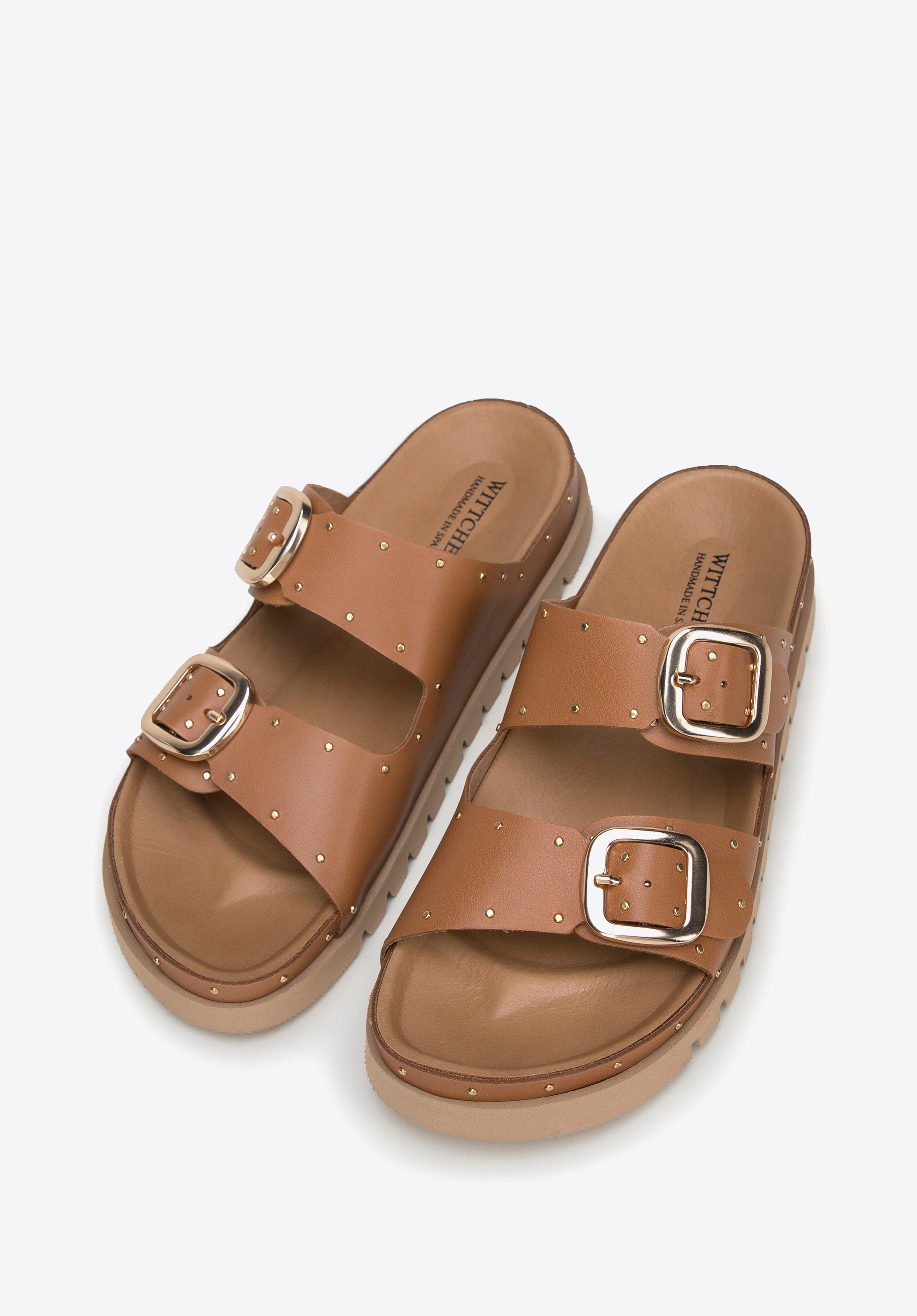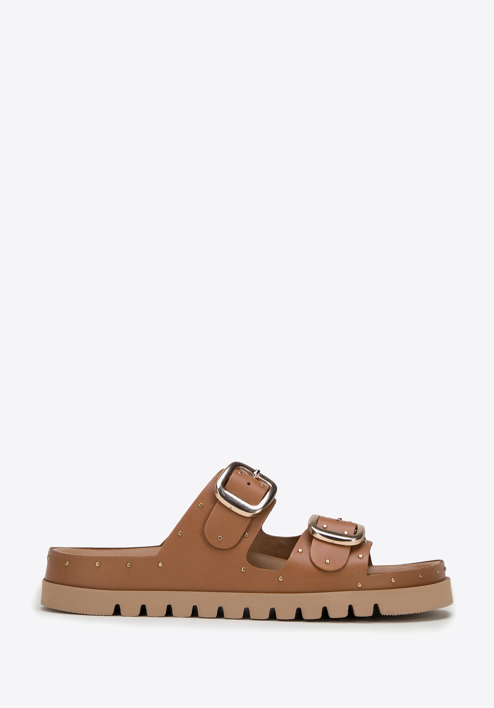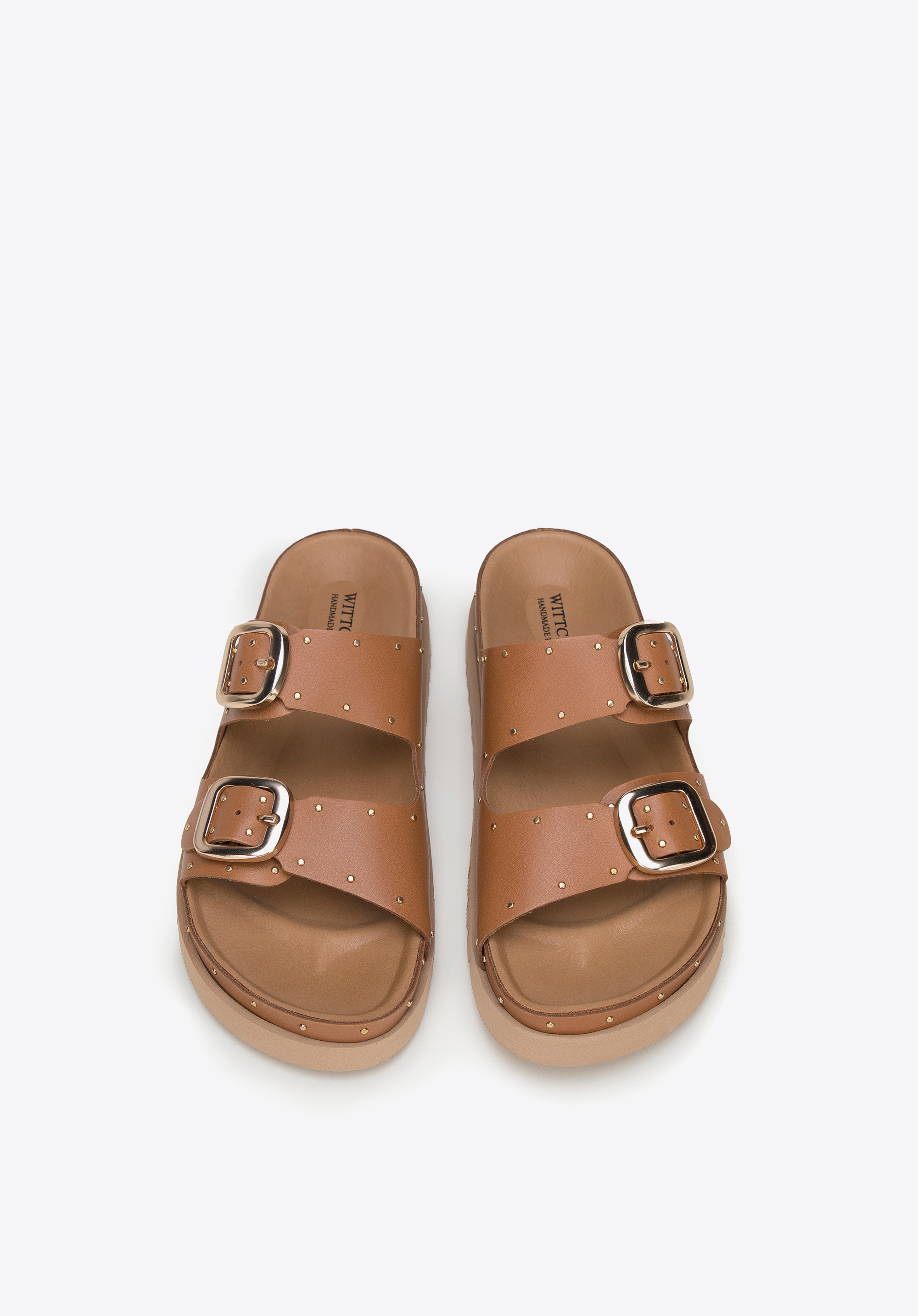 Жіночі шкіряні шльопанці з невеликими заклепками на платформі Колір: коричневий