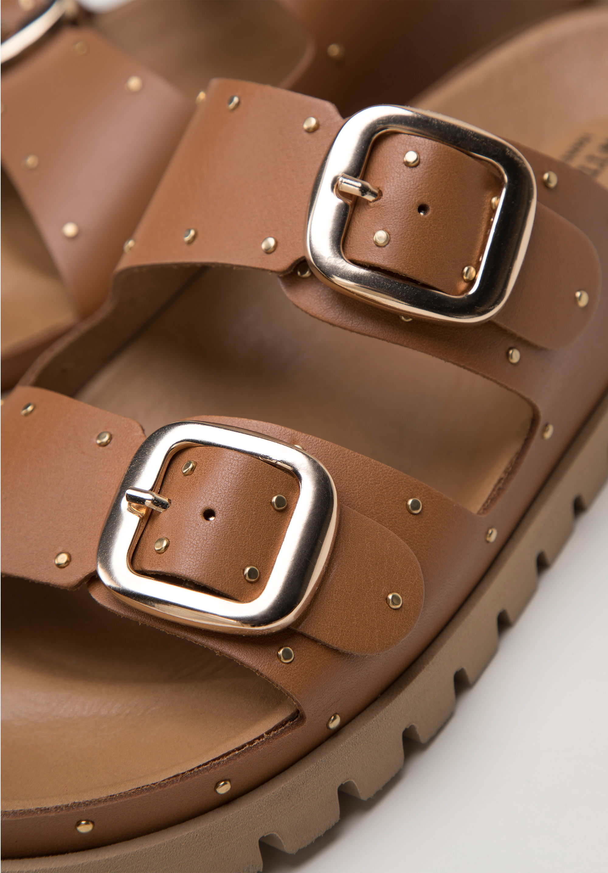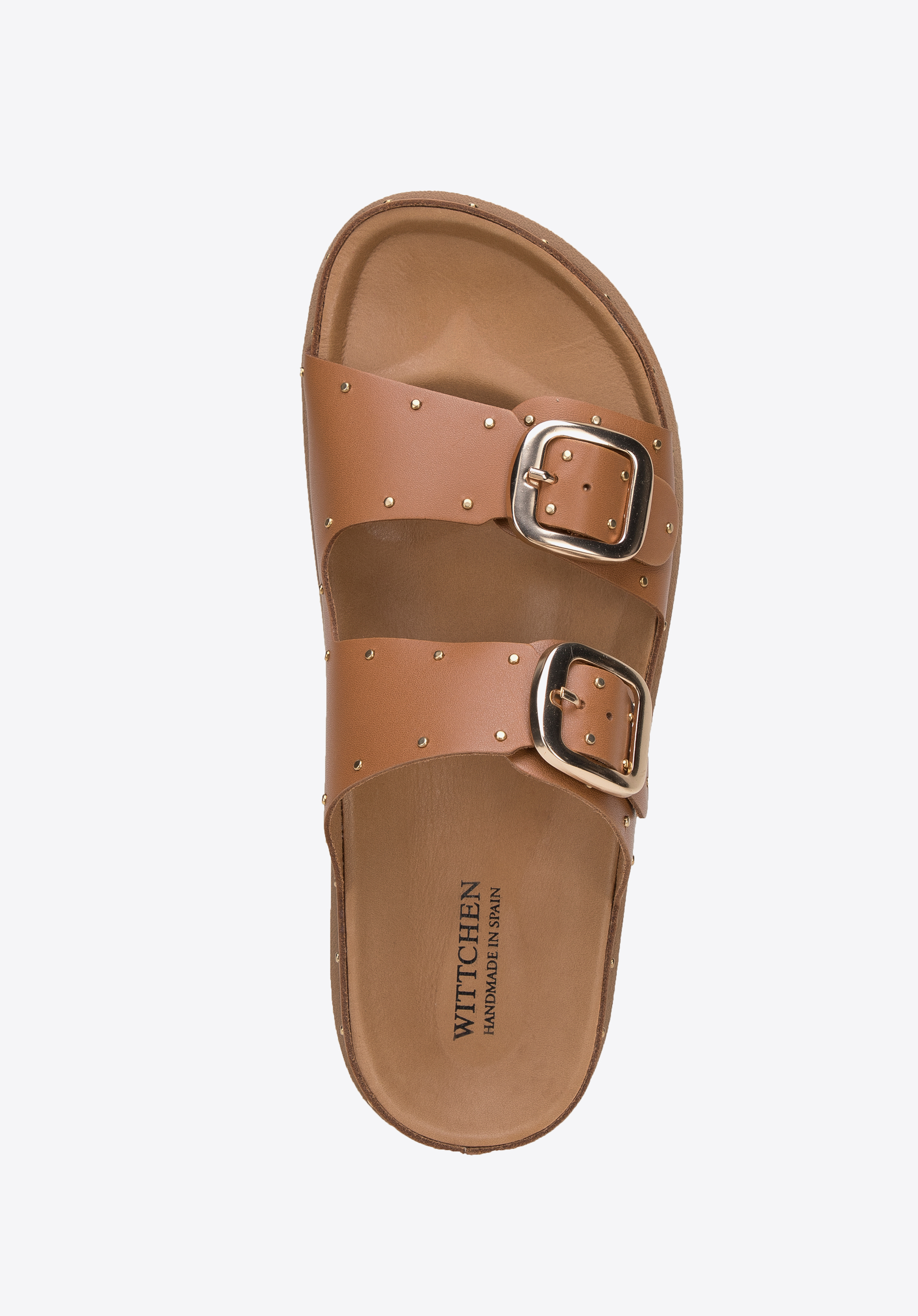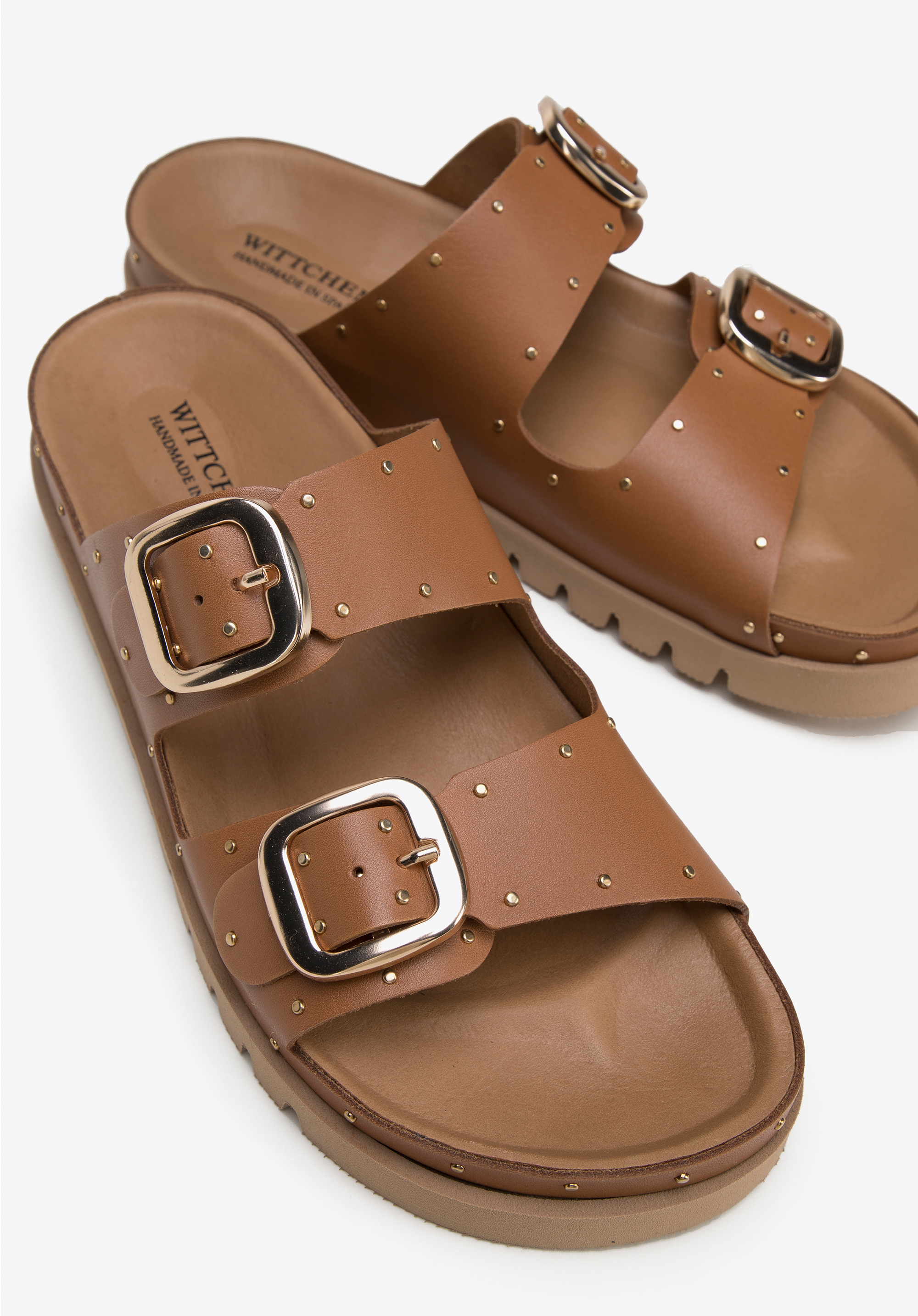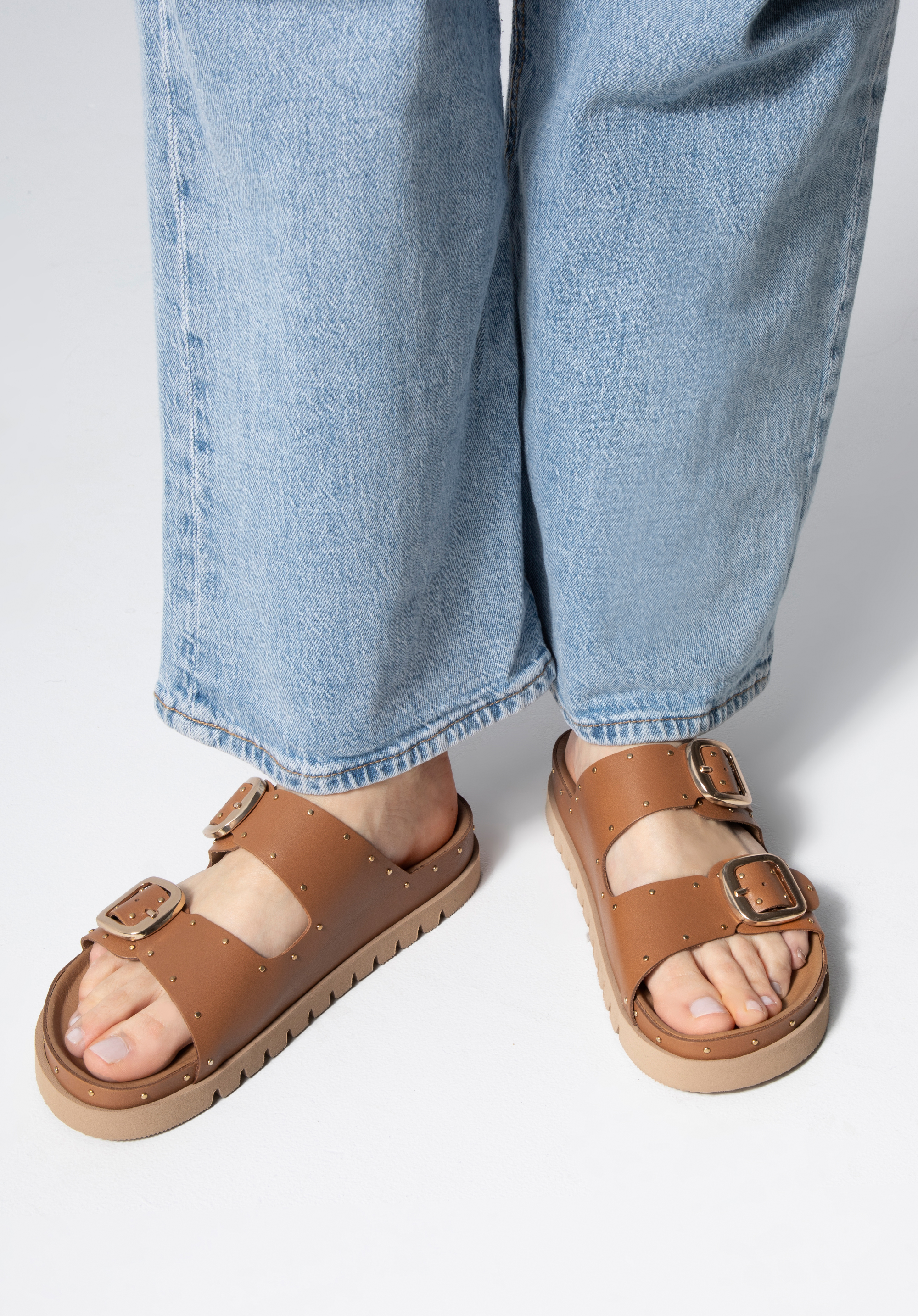 Жіночі шкіряні шльопанці з невеликими заклепками на платформі Колір: коричневий