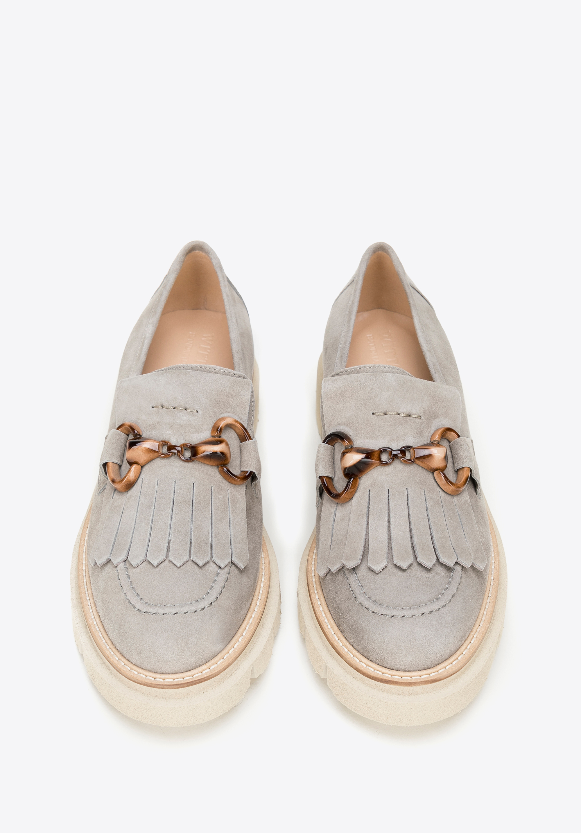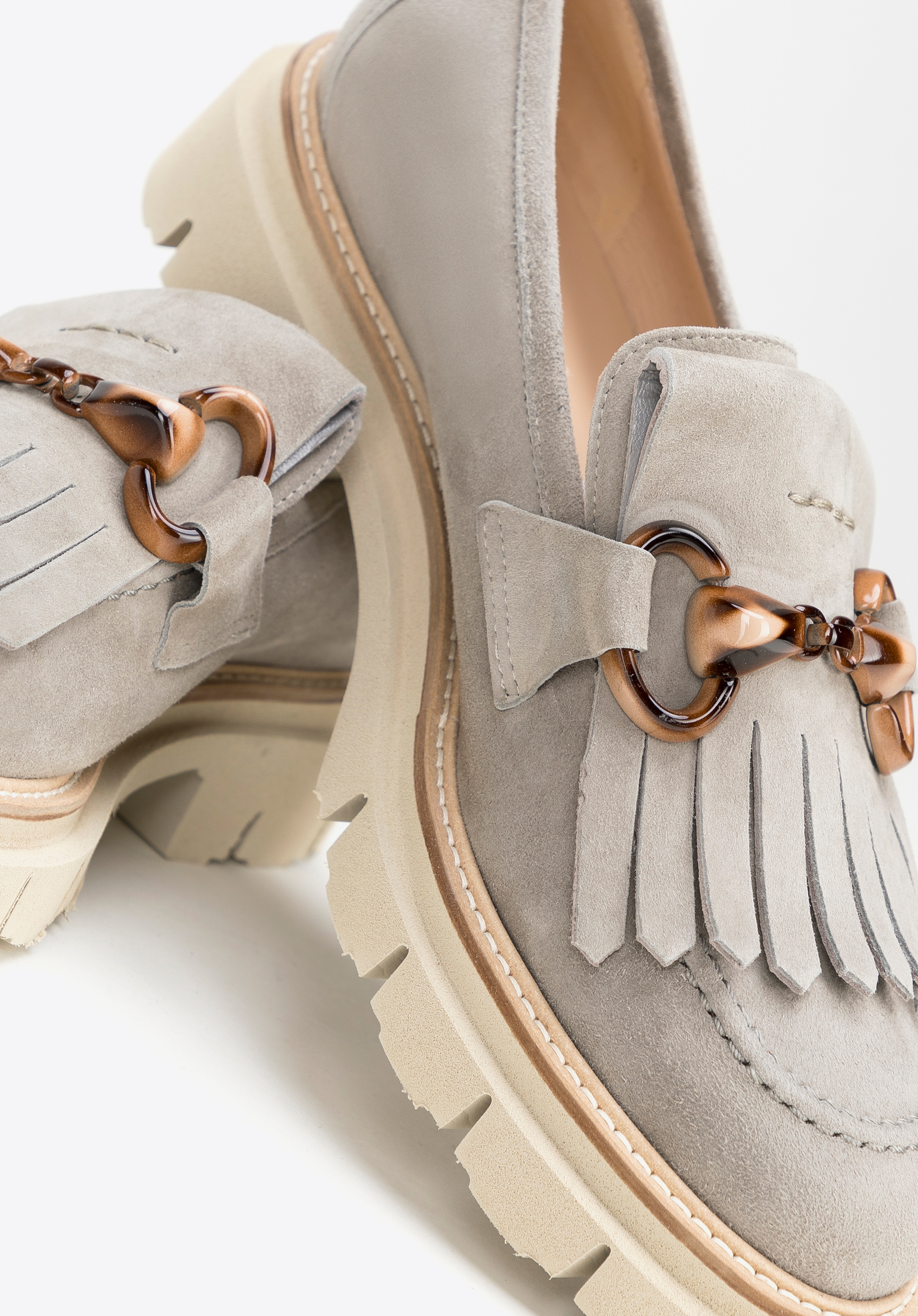 Це унікальне жіноче взуття привнесе новий стиль у ваш гардероб. Вони виготовлені в Італії з високоякісної замшевої шкіри. Спереду прикрашені візерунковою пряжкою та декоративною бахромою, що надає атмосферу бохо. М''яка, шкіряна устілка забезпечить комфортну багатогодинну ходьбу. Зручна платформа забезпечить хороше зчеплення і додасть кілька сантиметрів зросту. Жіночі замшеві мокасини з бахромою та пряжкою – чудовий вибір до улюбленої мінісукні, а також до широких джинсів та сорочки в квіточки.
