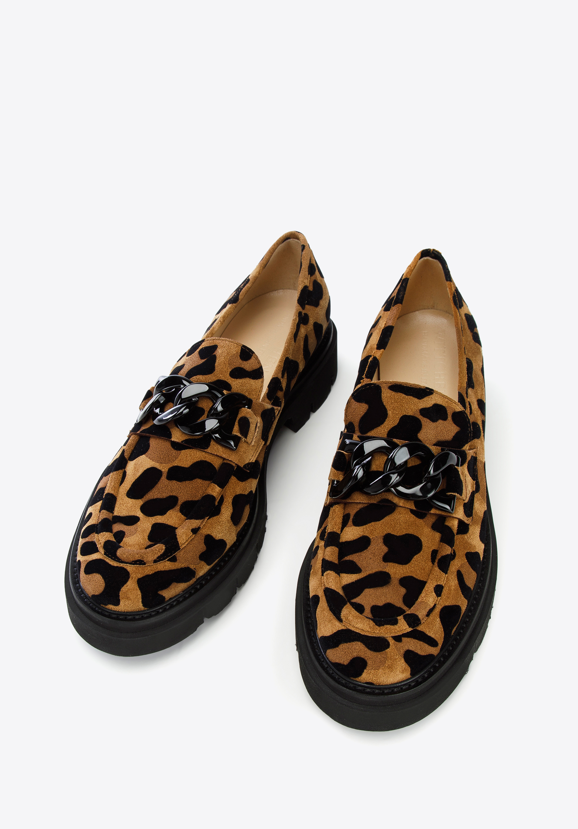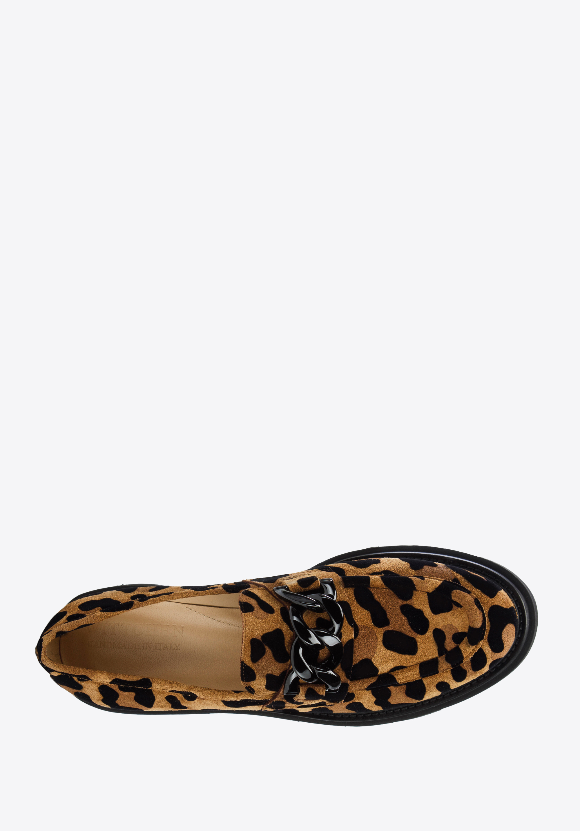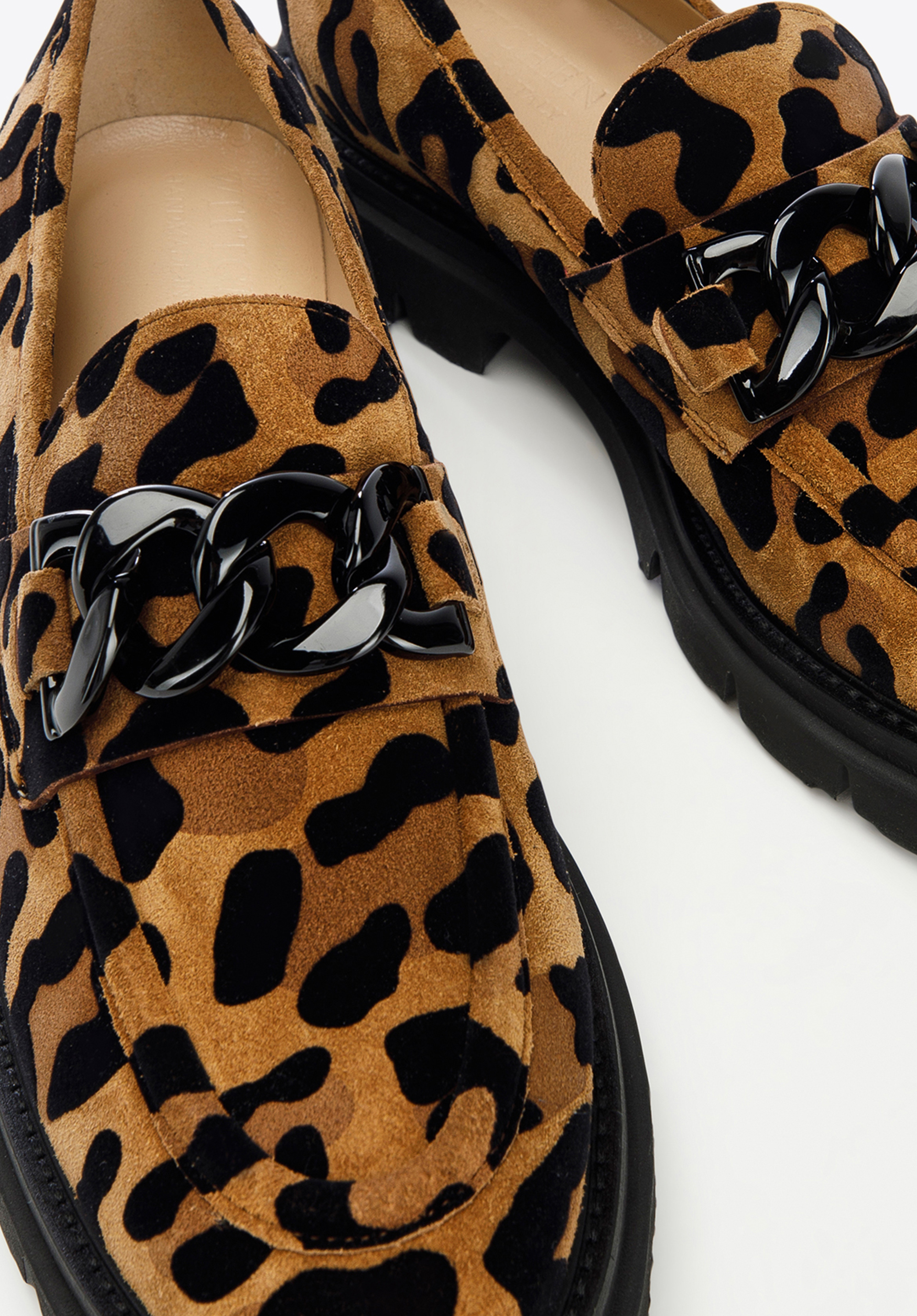 Це жіноче взуття - стильний і практичний аксесуар для любителів моди. Леопардовий принт урізноманітнює навіть саму просту укладку, будь то однотонна сукня або улюблені джинси і футболка. Мокасини виготовлені в Італії з високоякісної замшевої шкіри. Вони мають акуратний дизайн, доповнений товстим чорним ланцюжком. Шкіряна устілка з м''якою підкладкою забезпечує комфортну багатогодинну ходьбу як на роботі, так і після неї. Носити жіночі замшеві мокасини зі звіриним малюнком можна і навесні, і восени, і влітку - кожен день ви будете виглядати неповторно.