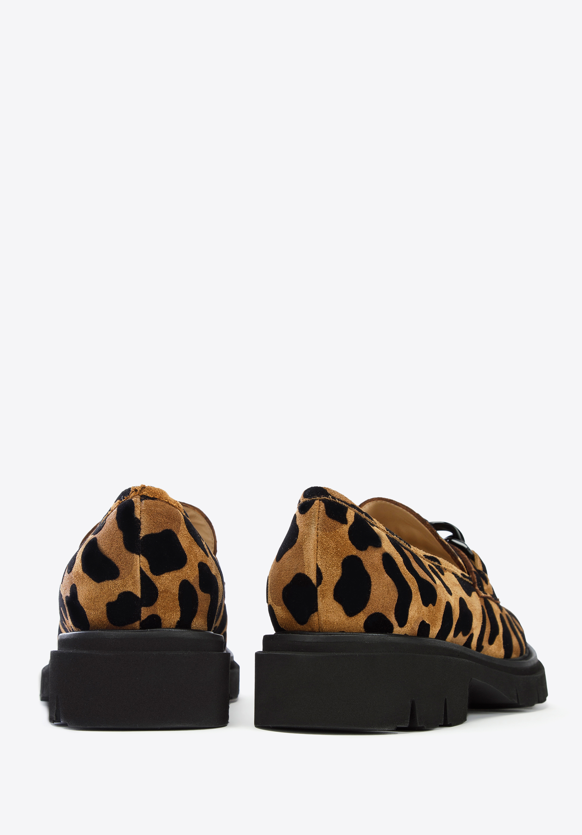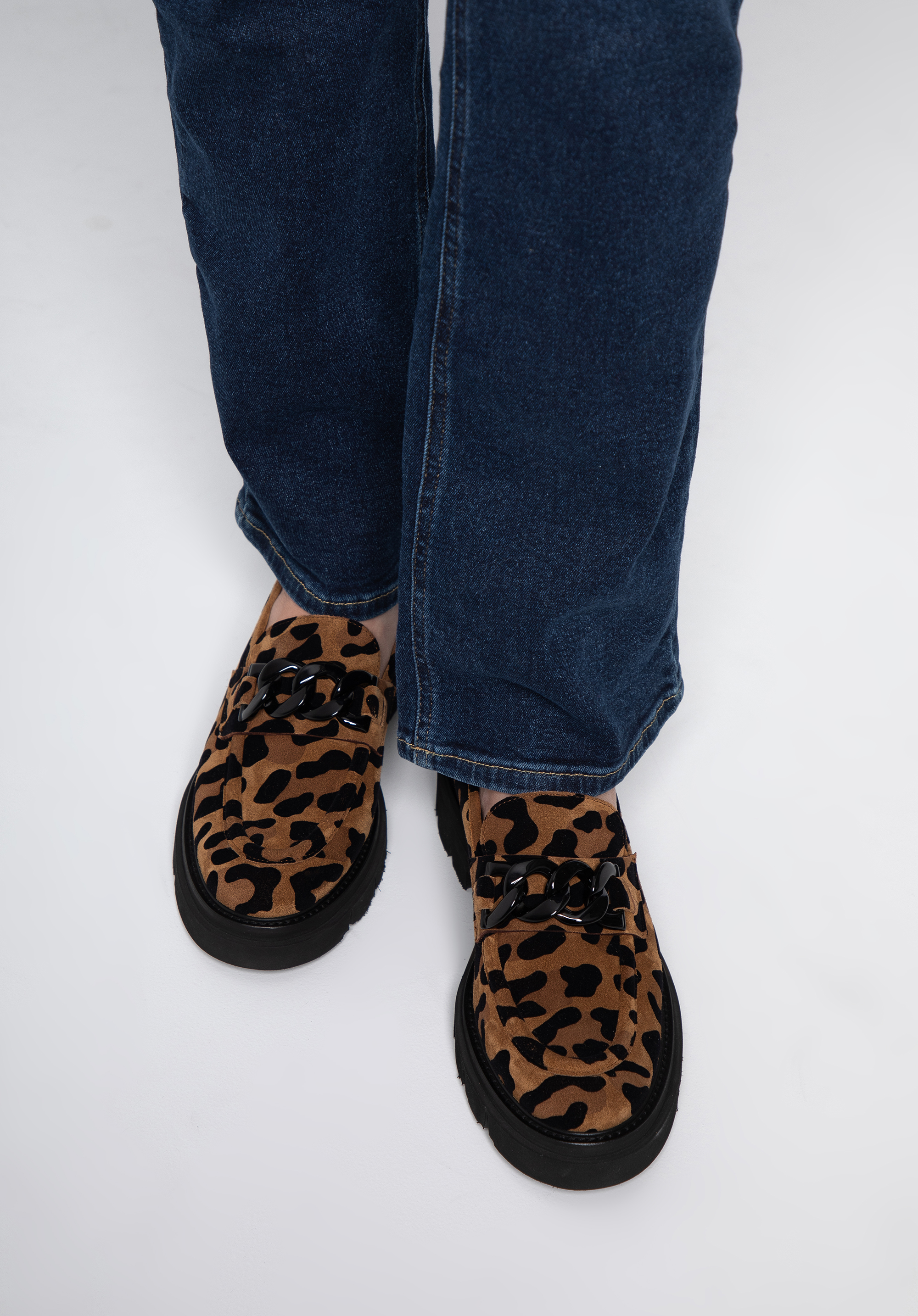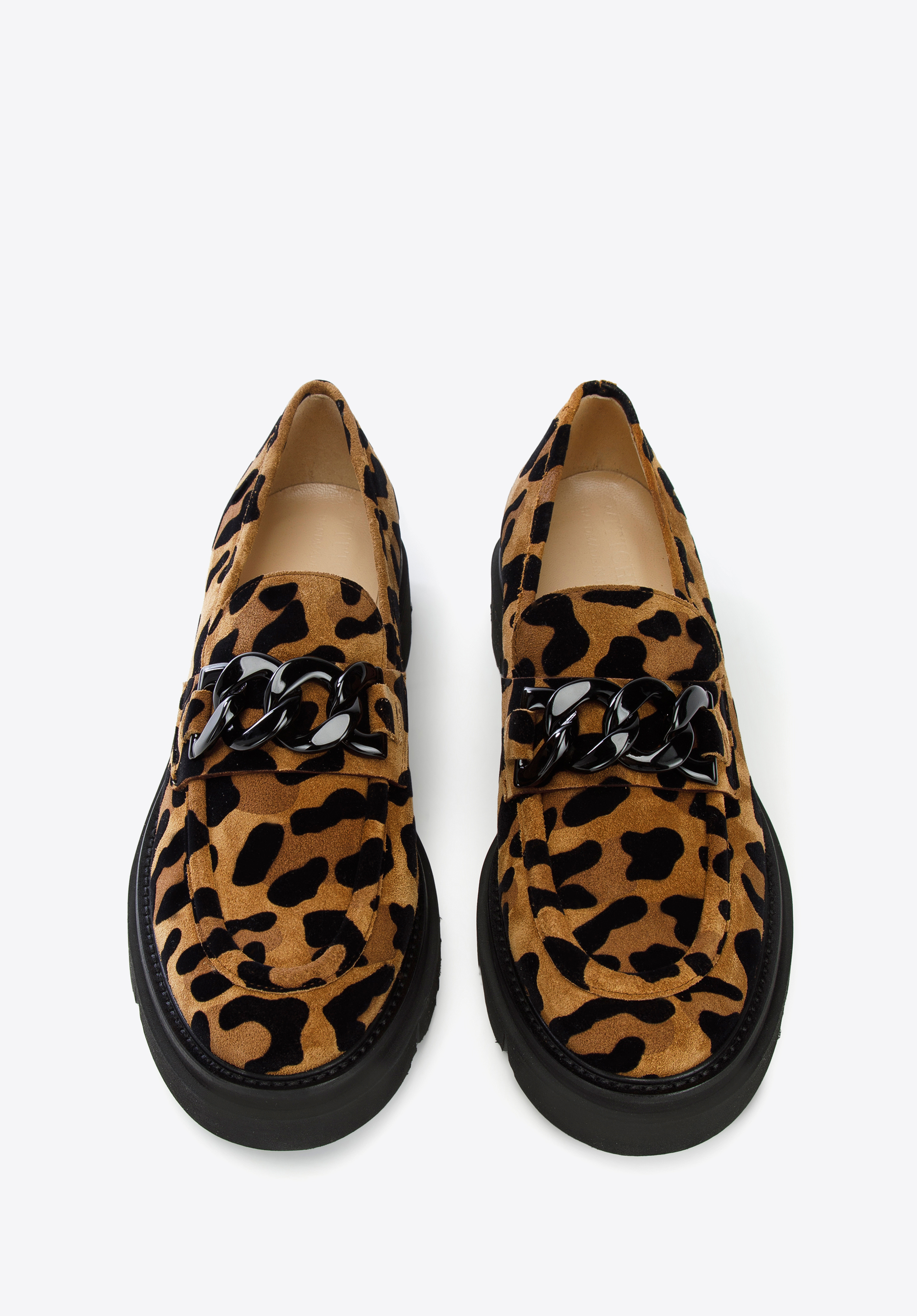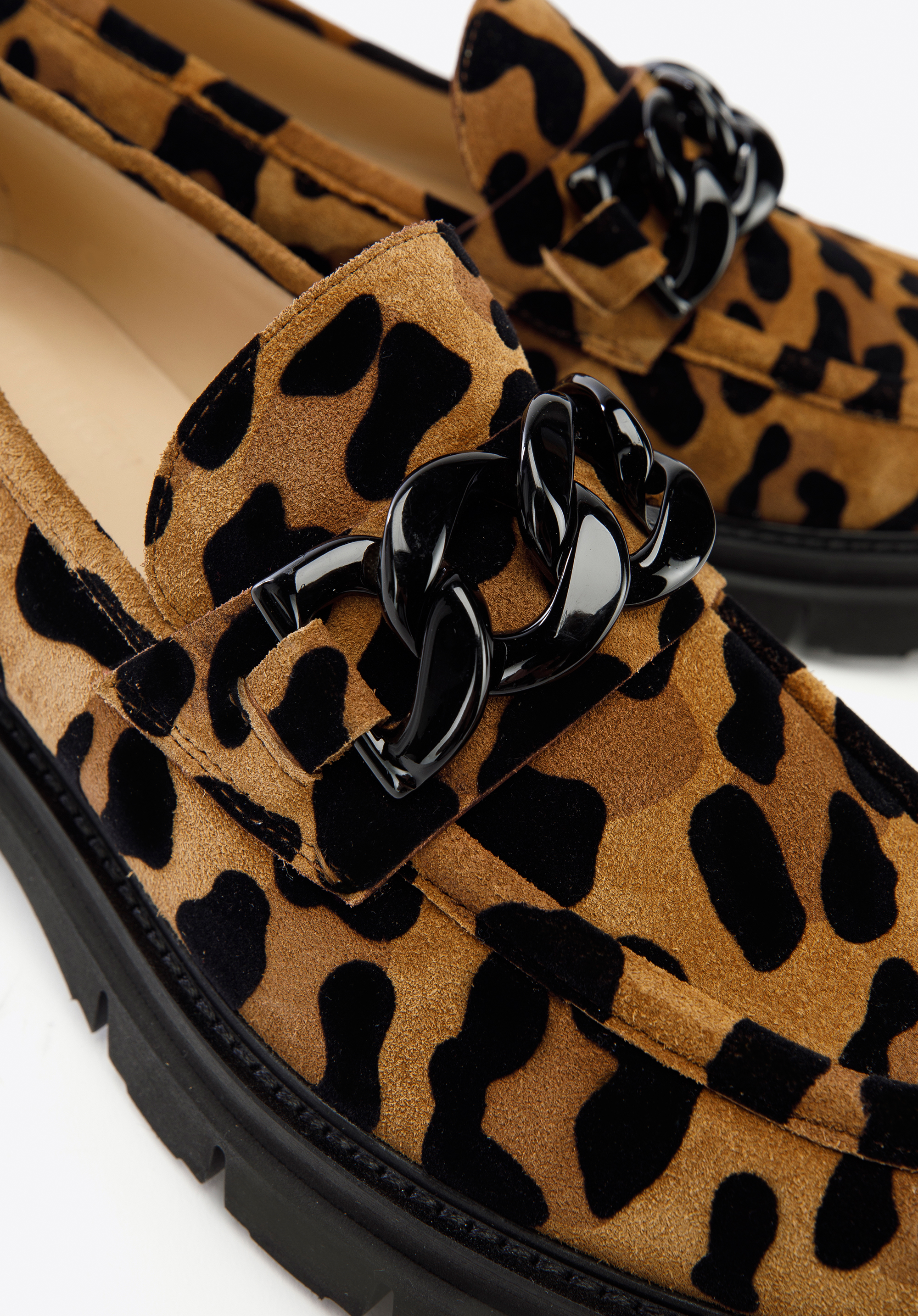 Це жіноче взуття - стильний і практичний аксесуар для любителів моди. Леопардовий принт урізноманітнює навіть саму просту укладку, будь то однотонна сукня або улюблені джинси і футболка. Мокасини виготовлені в Італії з високоякісної замшевої шкіри. Вони мають акуратний дизайн, доповнений товстим чорним ланцюжком. Шкіряна устілка з м''якою підкладкою забезпечує комфортну багатогодинну ходьбу як на роботі, так і після неї. Носити жіночі замшеві мокасини зі звіриним малюнком можна і навесні, і восени, і влітку - кожен день ви будете виглядати неповторно.