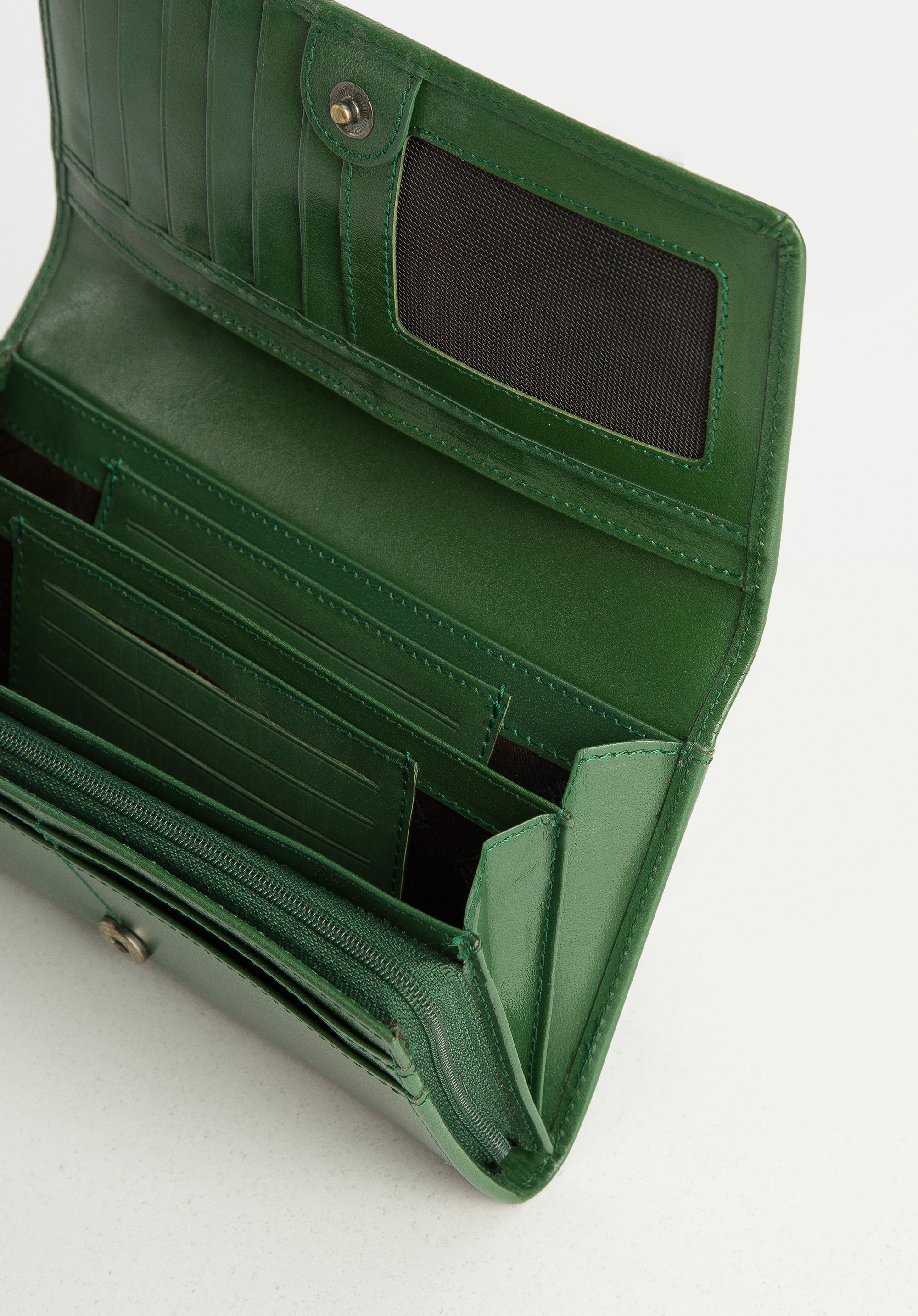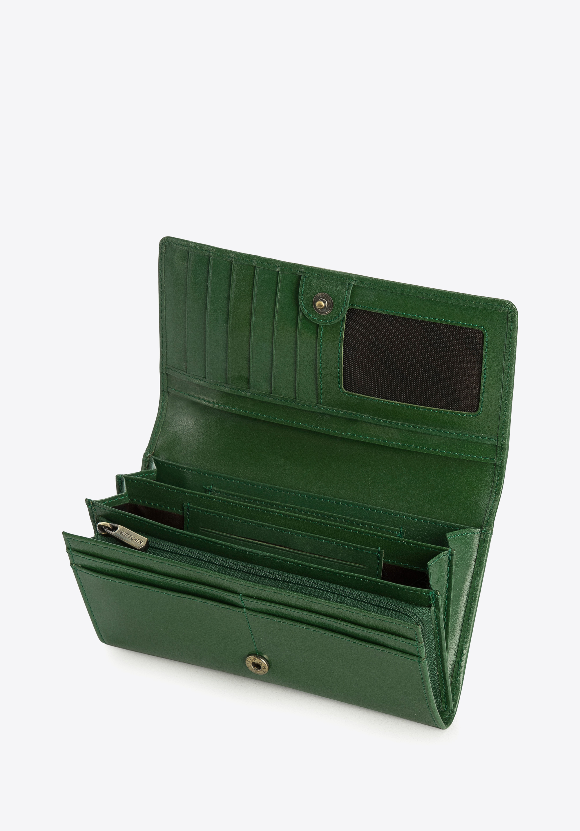 Цей гаманець припаде до смаку всім любителям класики, яким подобаються добре організовані аксесуари. Виготовлений з високоякісної натуральної шкіри, яка буде гарно виглядати протягом багатьох сезонів. Усередині він має багато слотів для карток, відкритих відділень, кишеню для монет на блискавці та сітчасту кишеню для зберігання, наприклад, вашої фотографії або квитка. Крім того, підкладка в цій моделі захищає карти від зчитування даних (RFID). Жіночий горизонтальний гаманець з гладкої шкіри - елегантний повсякденний аксесуар для кожної стильної жінки.