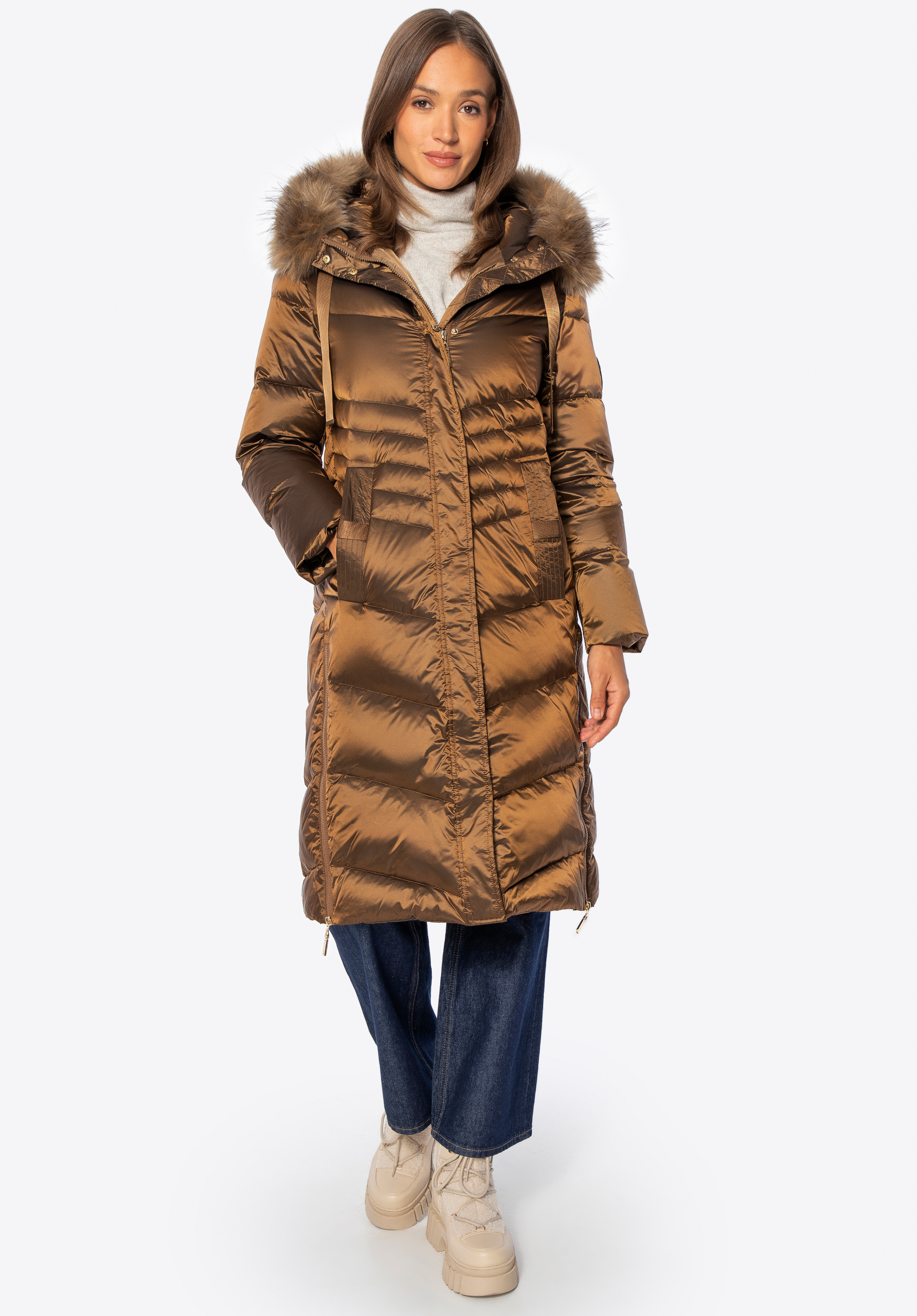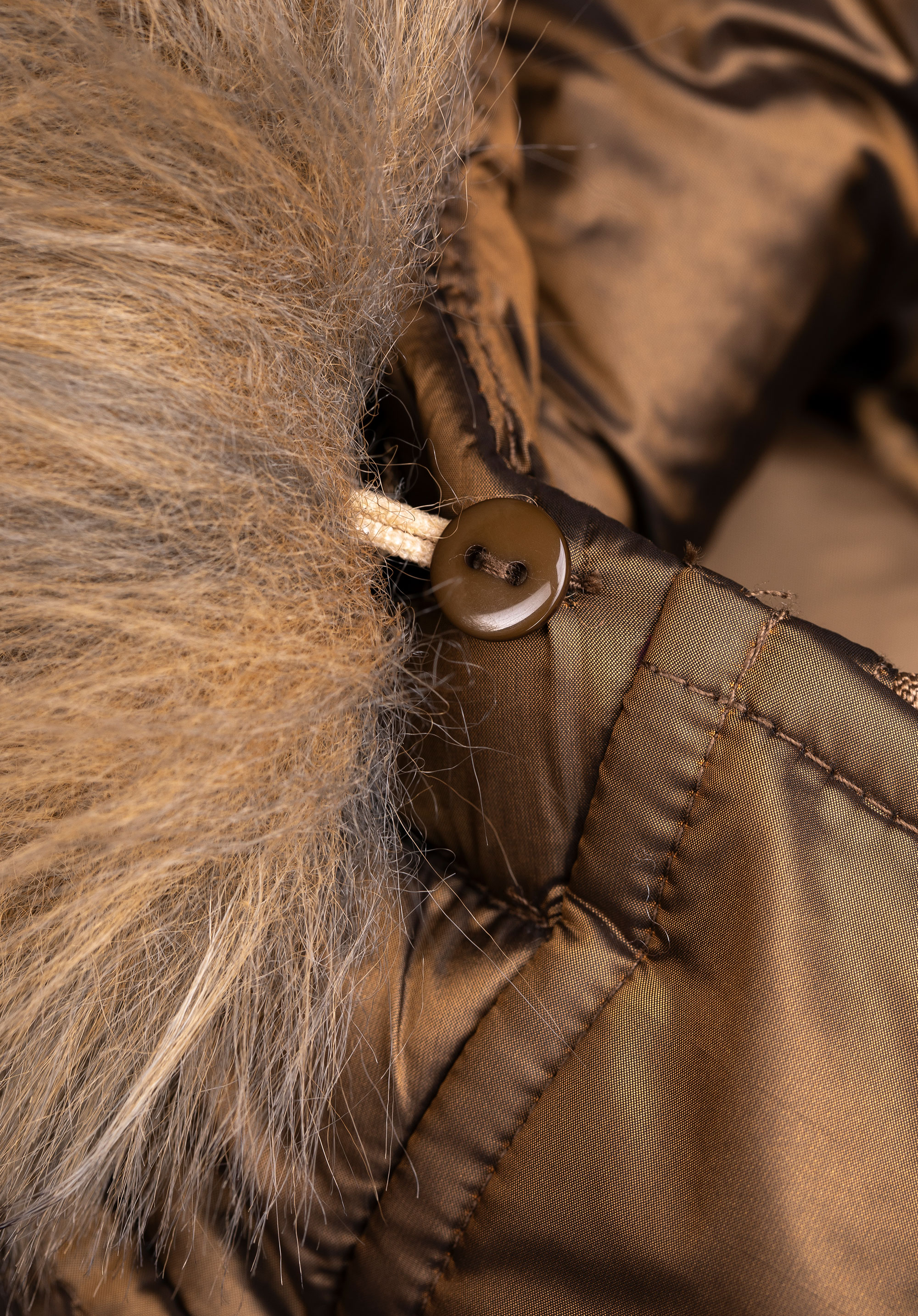 - Знімний капюшон: З декоративним хутром і регулюванням дозволяє адаптувати пальто до погодних умов і стилю.
