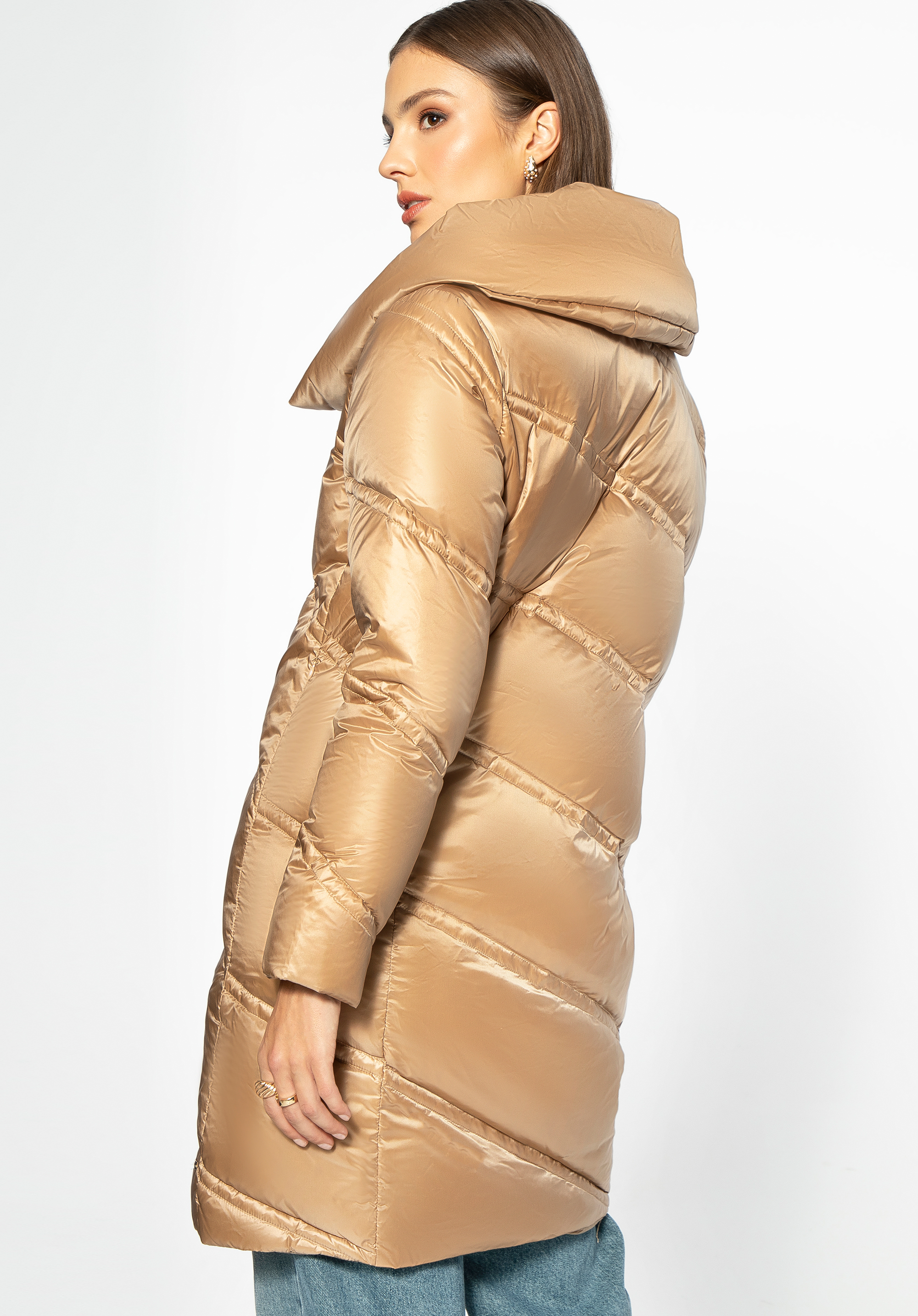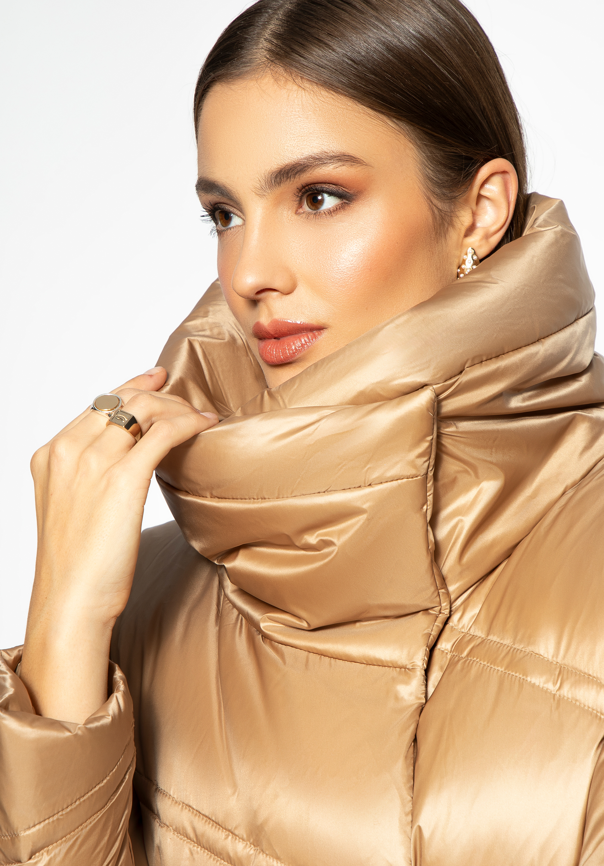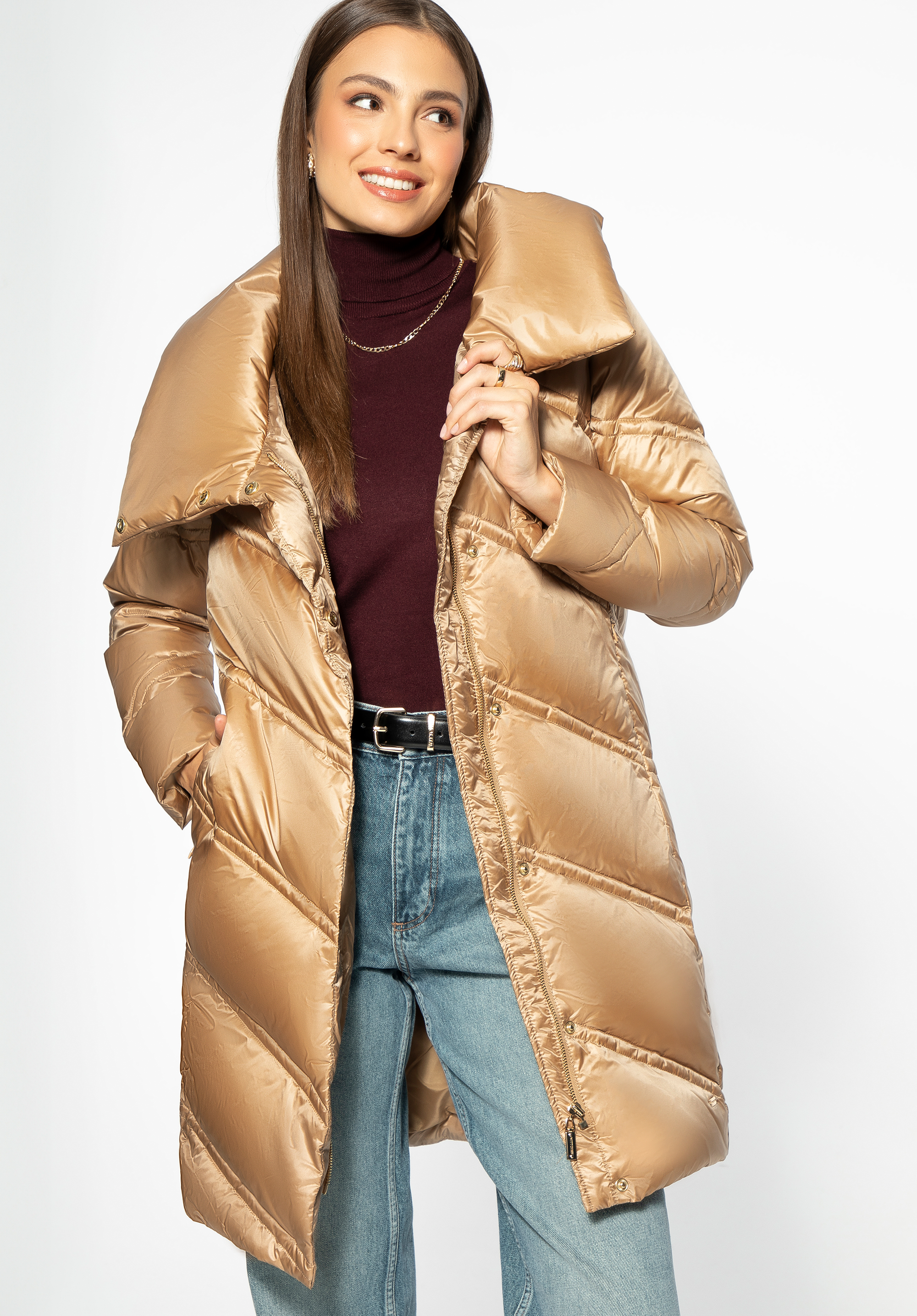 Пуховик для осені та зими. Всередині він наповнений пухом з додаванням пір''я для запобігання злипання. Така суміш відмінно ізолює від холоду. Ще тепліше буде, якщо надіти високий комір і застібнути його на кнопки. Також зверніть увагу на легкий блиск високоякісного нейлону та привабливу строчку, яка додає стилю куртці. Бічні кишені - чудове місце, щоб сховати руки. Цей жіночий пуховик із високим коміром окутає вас у прохолодні місяці.