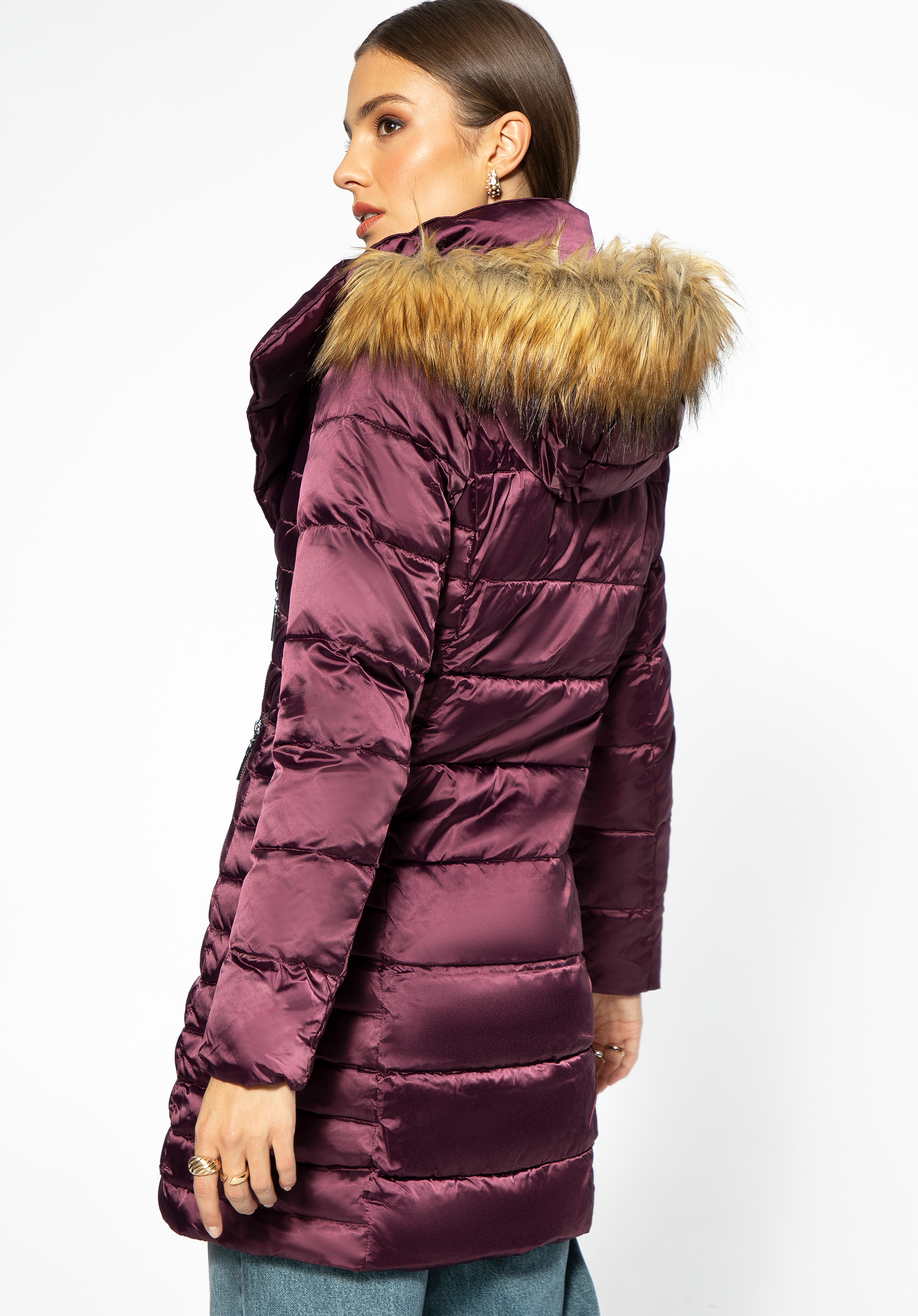 Ця стильна жіноча куртка стане ідеальним аксесуаром для осені та зими. Виконана вона з приємного на дотик, злегка блискучого нейлону. Капюшон оброблений штучним хутром. Наповнювач з натурального пуху зігріє вас у найхолодніші дні. Асиметрична застібка та стьобання додають характеру всьому та вписують одяг у сучасні тренди. Жіночий пуховик з асиметричною застібкою - непідвладний часу вибір на багато сезонів.