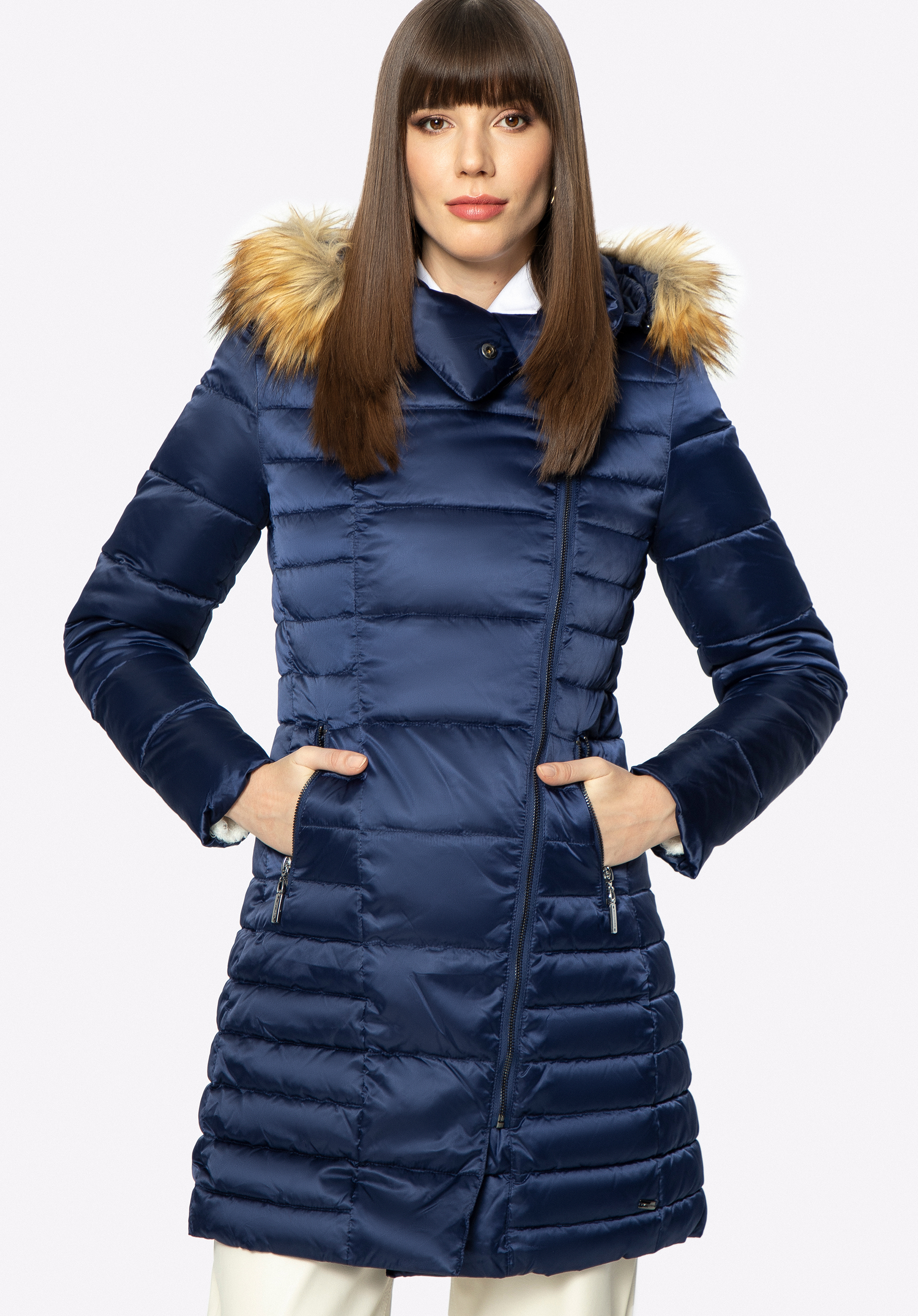 Ця стильна жіноча куртка стане ідеальним аксесуаром для осені та зими. Виконана вона з приємного на дотик, злегка блискучого нейлону. Капюшон оброблений штучним хутром. Наповнювач з натурального пуху зігріє вас у найхолодніші дні. Асиметрична застібка та стьобання додають характеру всьому та вписують одяг у сучасні тренди. Жіночий пуховик з асиметричною застібкою - непідвладний часу вибір на багато сезонів.