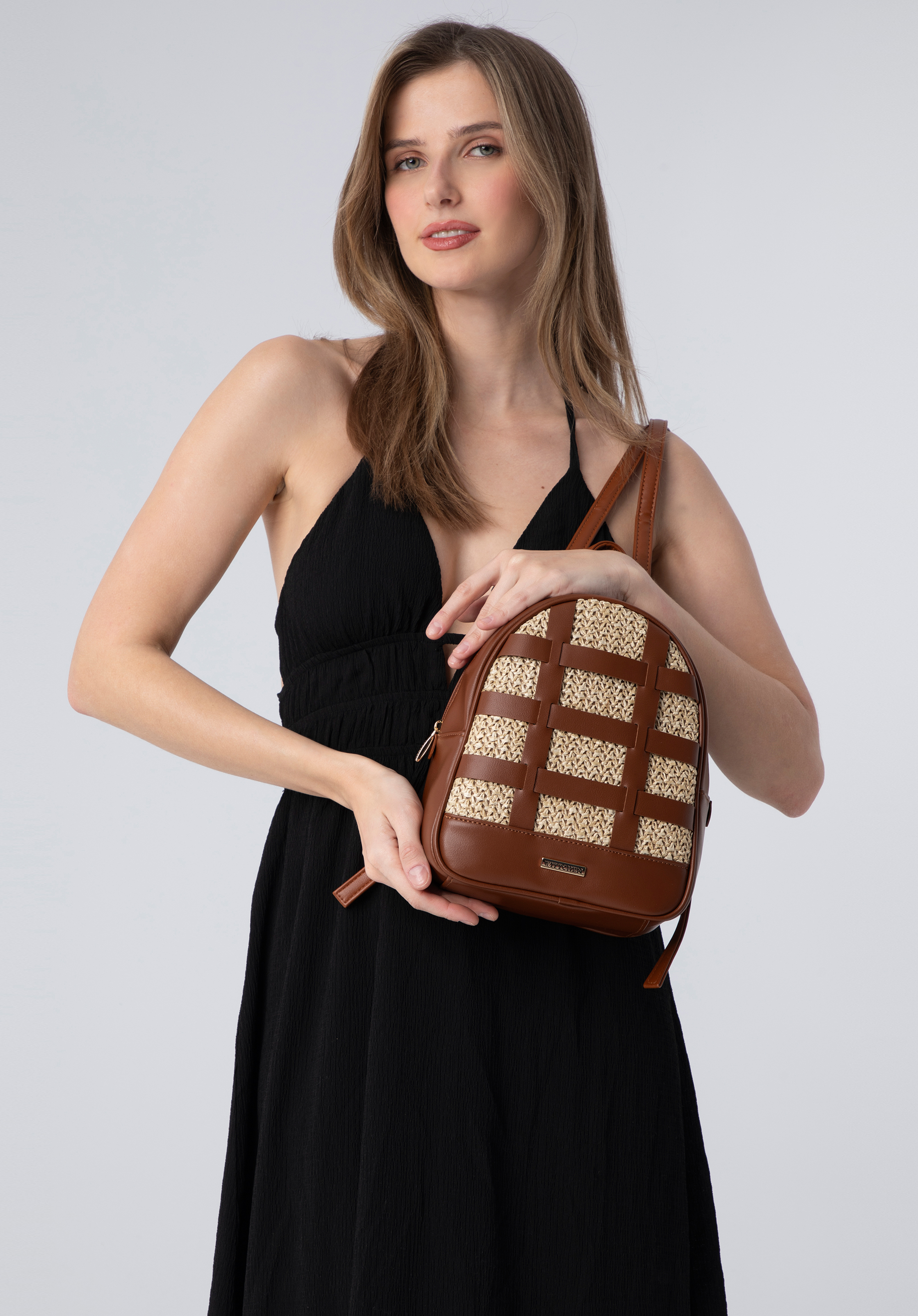 Цей акуратний рюкзак урізноманітнить ваш літній образ. Виготовлений з приємної на дотик екошкіри. Передня частина виконана з плетіння у вигляді соломи та доповнена привабливим картатим візерунком. Всередині можна помістити гаманець, телефон, кілька косметичних засобів і запасний шарф - ідеально підходить для огляду визначних пам''яток на вихідних, кави з другом або прогулянки. Поєднуйте його з літньою, повітряною сукнею та капелюшком або додайте характеру класичним джинсам і сорочці. Жіночий рюкзак з екошкіри з плетеною вставкою - відмінний вибір для любительок модних аксесуарів.