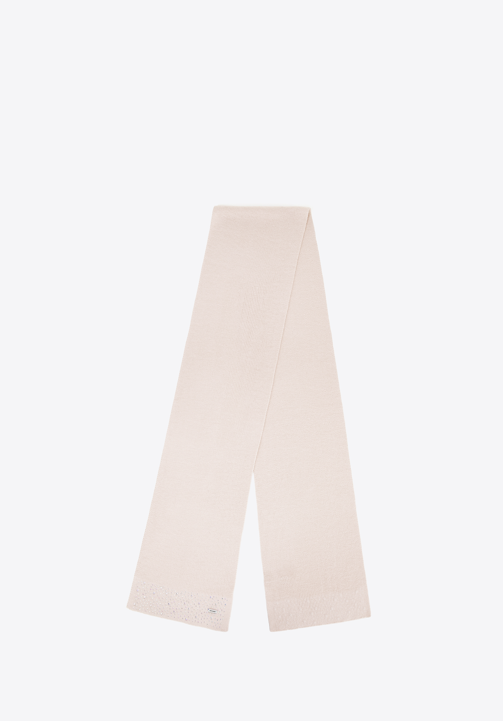 Цей шарф – ідеальне поєднання жіночого шарму та повсякденного комфорту. Виготовлений з м’якого акрилу, він легкий, приємний на дотик та ідеально підходить для зимових днів. Ніжні, мерехтливі стрази додають елегантного сяйва, а акуратно оброблені краї демонструють увагу до кожної деталі. Невеликий логотип бренду на одному кінці – це делікатний акцент, який доповнює образ стильно.