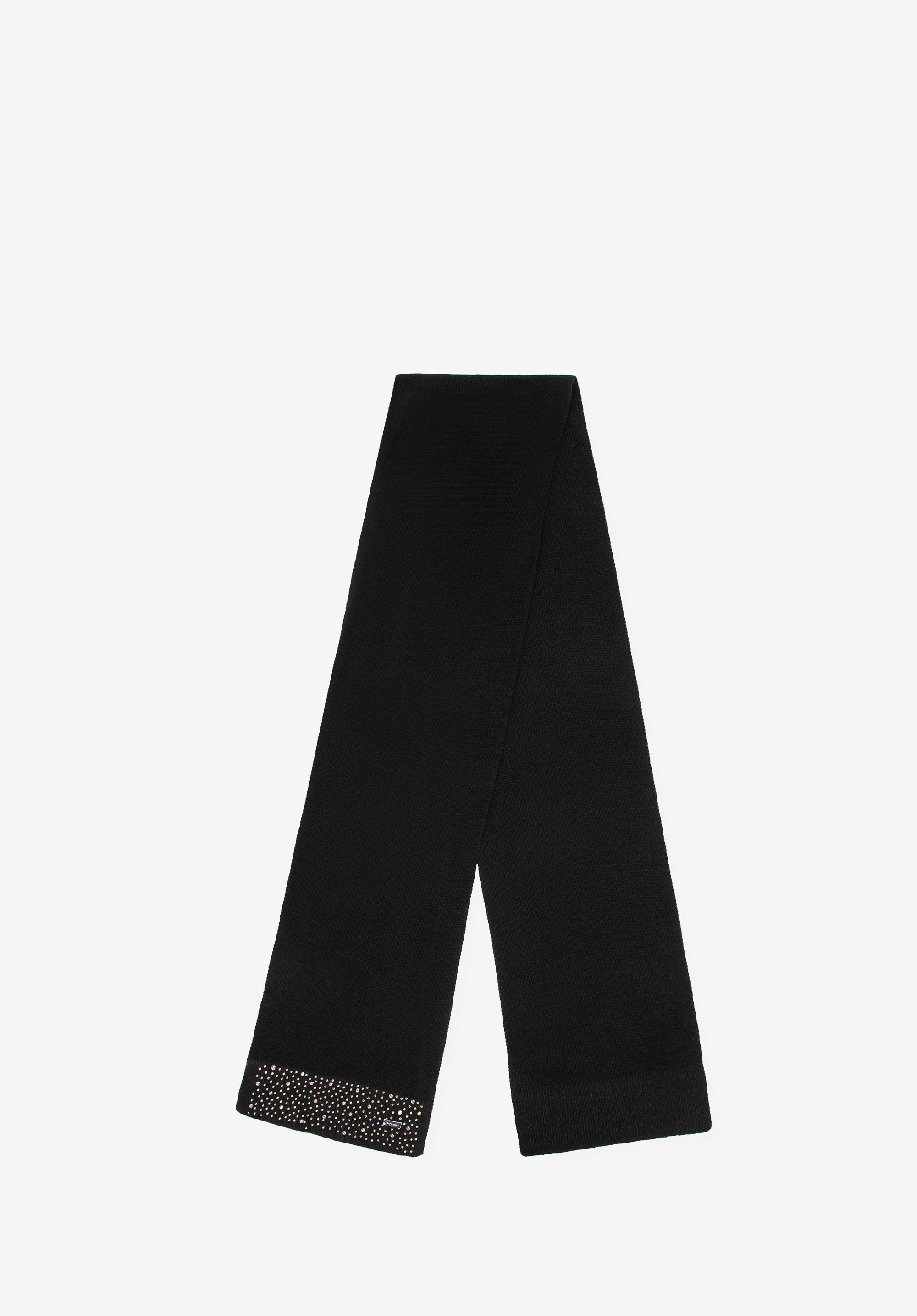 Цей шарф – ідеальне поєднання жіночого шарму та повсякденного комфорту. Виготовлений з м’якого акрилу, він легкий, приємний на дотик та ідеально підходить для зимових днів. Ніжні, мерехтливі стрази додають елегантного сяйва, а акуратно оброблені краї демонструють увагу до кожної деталі. Невеликий логотип бренду на одному кінці – це делікатний акцент, який доповнює образ стильно.