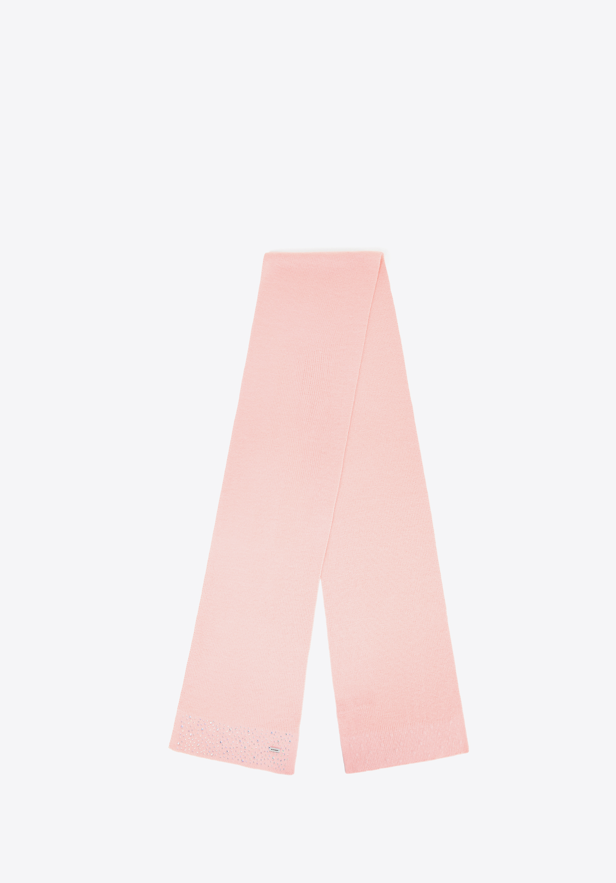 Цей шарф – ідеальне поєднання жіночого шарму та повсякденного комфорту. Виготовлений з м’якого акрилу, він легкий, приємний на дотик та ідеально підходить для зимових днів. Ніжні, мерехтливі стрази додають елегантного сяйва, а акуратно оброблені краї демонструють увагу до кожної деталі. Невеликий логотип бренду на одному кінці – це делікатний акцент, який доповнює образ стильно.