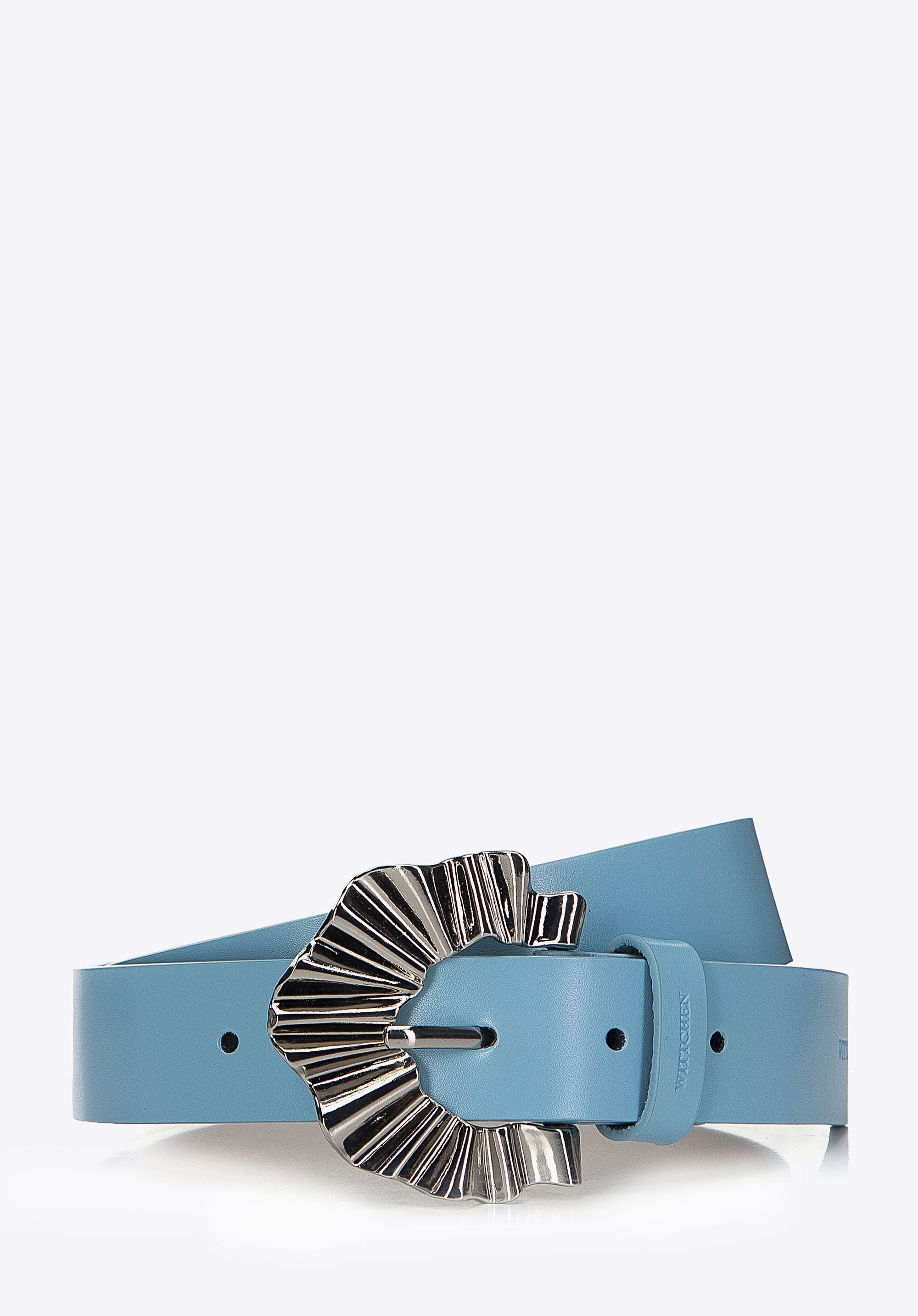 У гардеробі кожної жінки потрібен шкіряний ремінь з оригінальною пряжкою. Дана модель виготовлена з високоякісної натуральної шкіри з матовим покриттям. Декоративна, хвиляста пряжка ніжно блищить і урізноманітнює будь-який наряд: улюблені джинси і футболку, або, наприклад, гладку сукню-кльош. Жіночий шкіряний ремінь з декоративною пряжкою - відмінний вибір для кожної сучасної жінки.