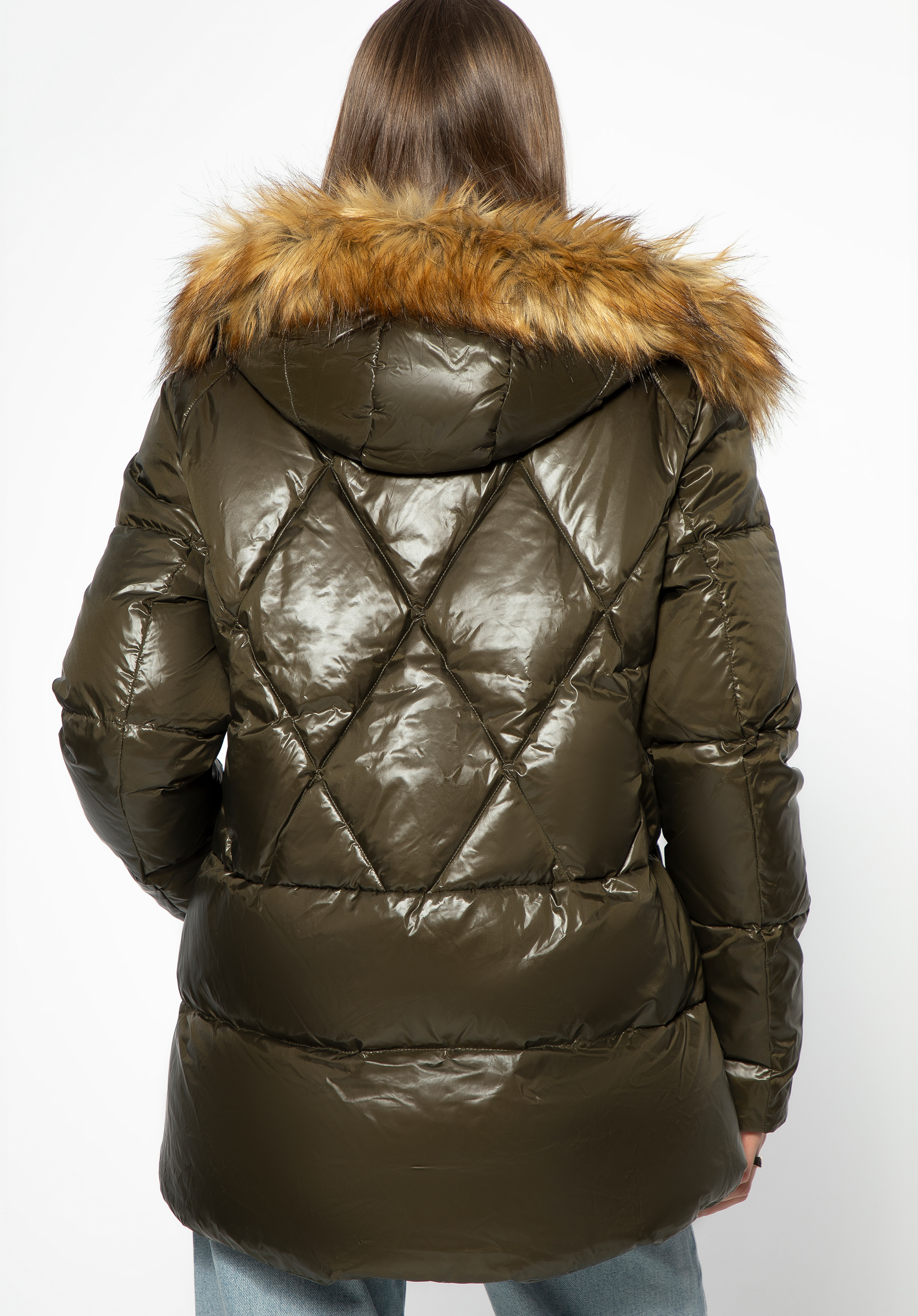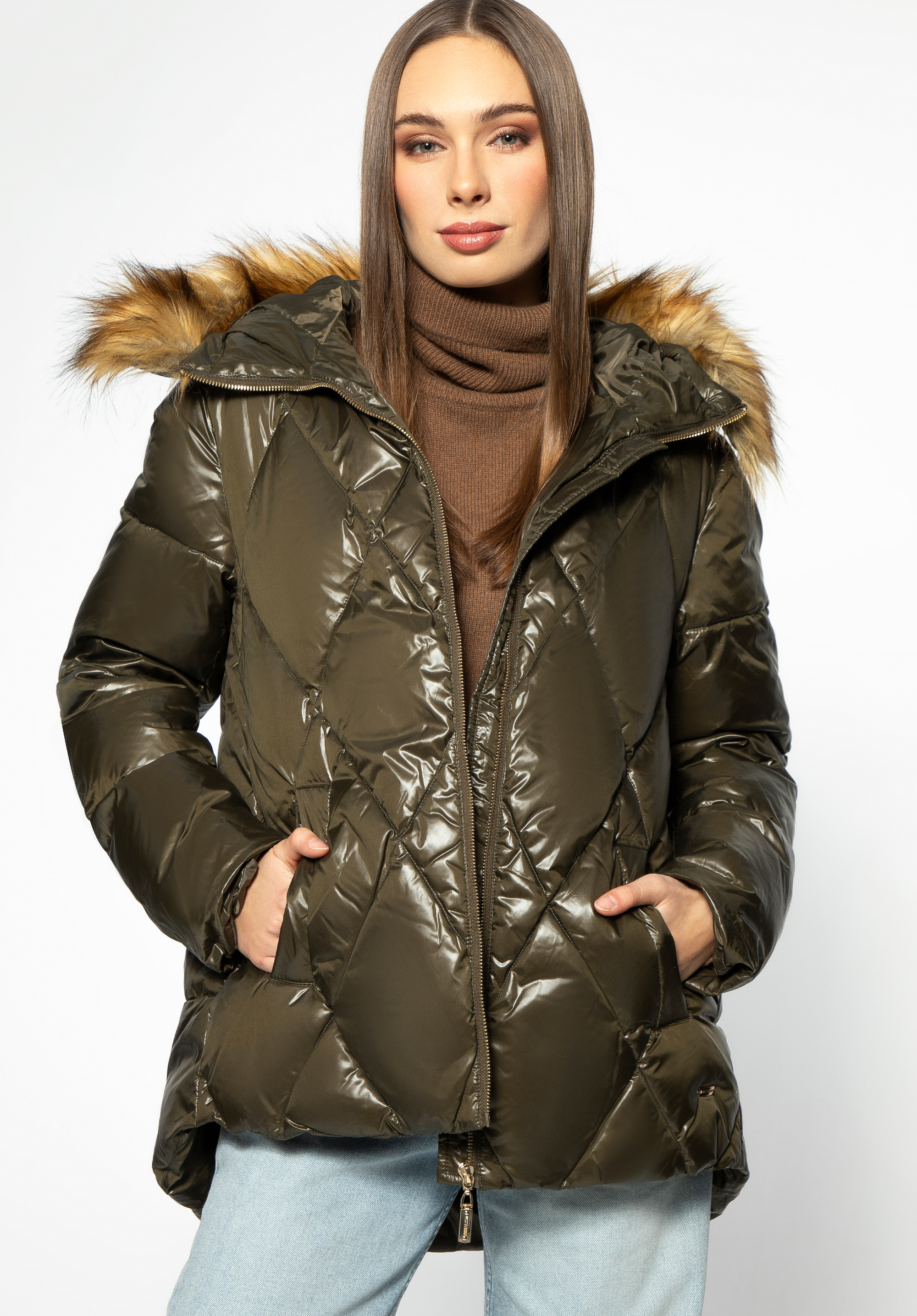 Ця стильна куртка - чудовий вибір для любителів модних аксесуарів. Вона досить довга, а завдяки наповненню з 50% качиного пуху і 50% качиного пера зігріє вас восени і взимку. Блискучий матеріал і золотисті блискавки надають їй шикарного вигляду. Вона має трапецієподібний крій і подовжена ззаду. У відкритих бічних кишенях можна зручно сховати руки в холодні дні. Вона чудово виглядатиме як зі спортивними стилізаціями, так і з улюбленим повсякденним платтям. Жіночий стьобаний пуховик-трапеція - це практичний і стильний аксесуар, який прослужить вам багато сезонів.