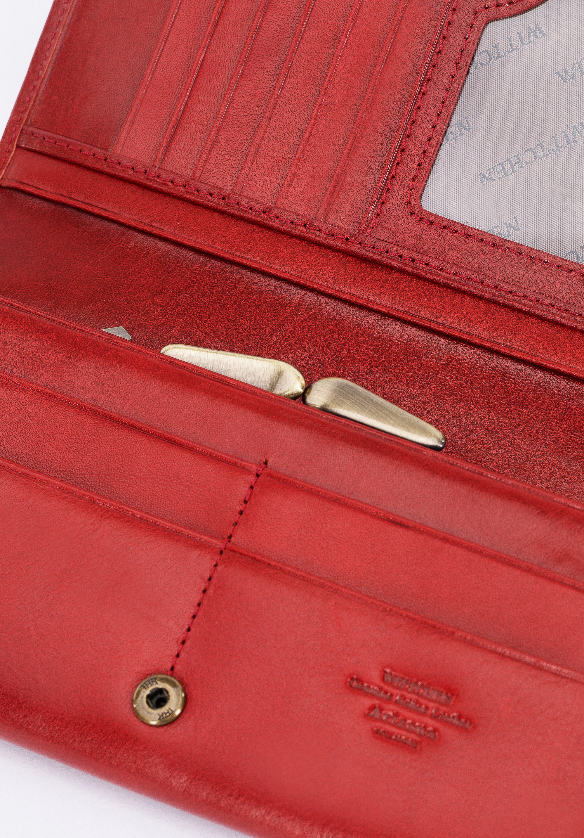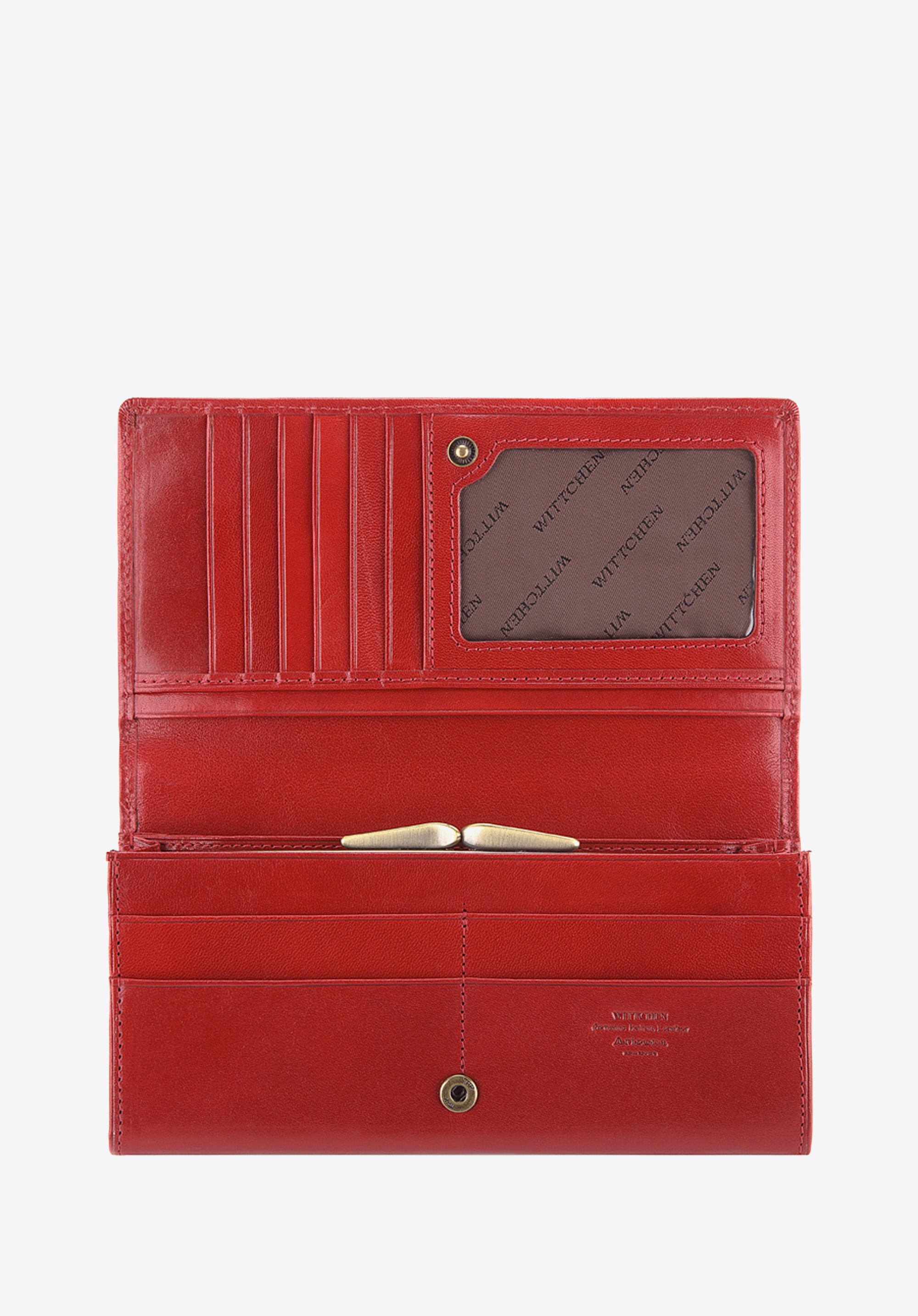 Великий жіночий гаманець красиво прикрашений гербом WITTCHEN кольору старого золота, виконаний з великою точністю. Ретельно оброблена теляча шкіра є гарантією високої якості і елегантного зовнішнього вигляду.