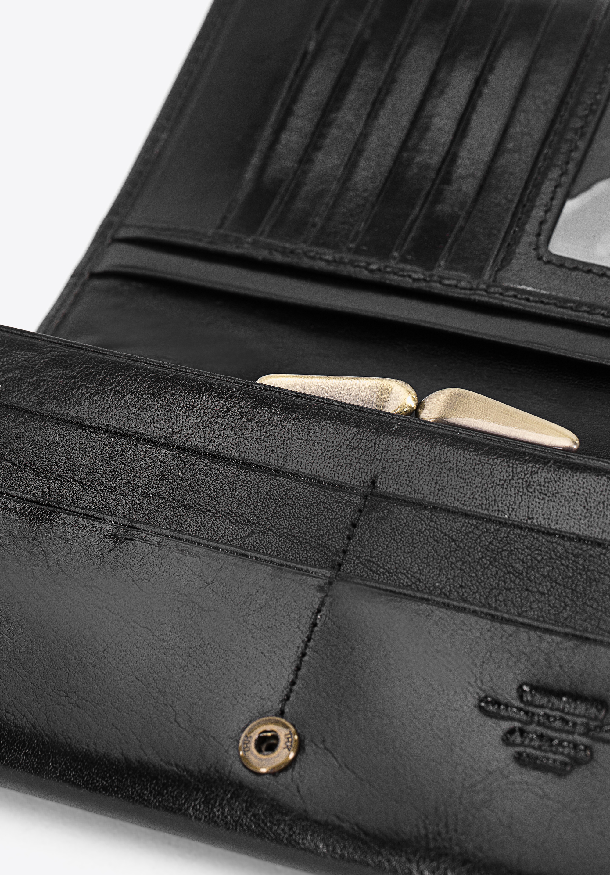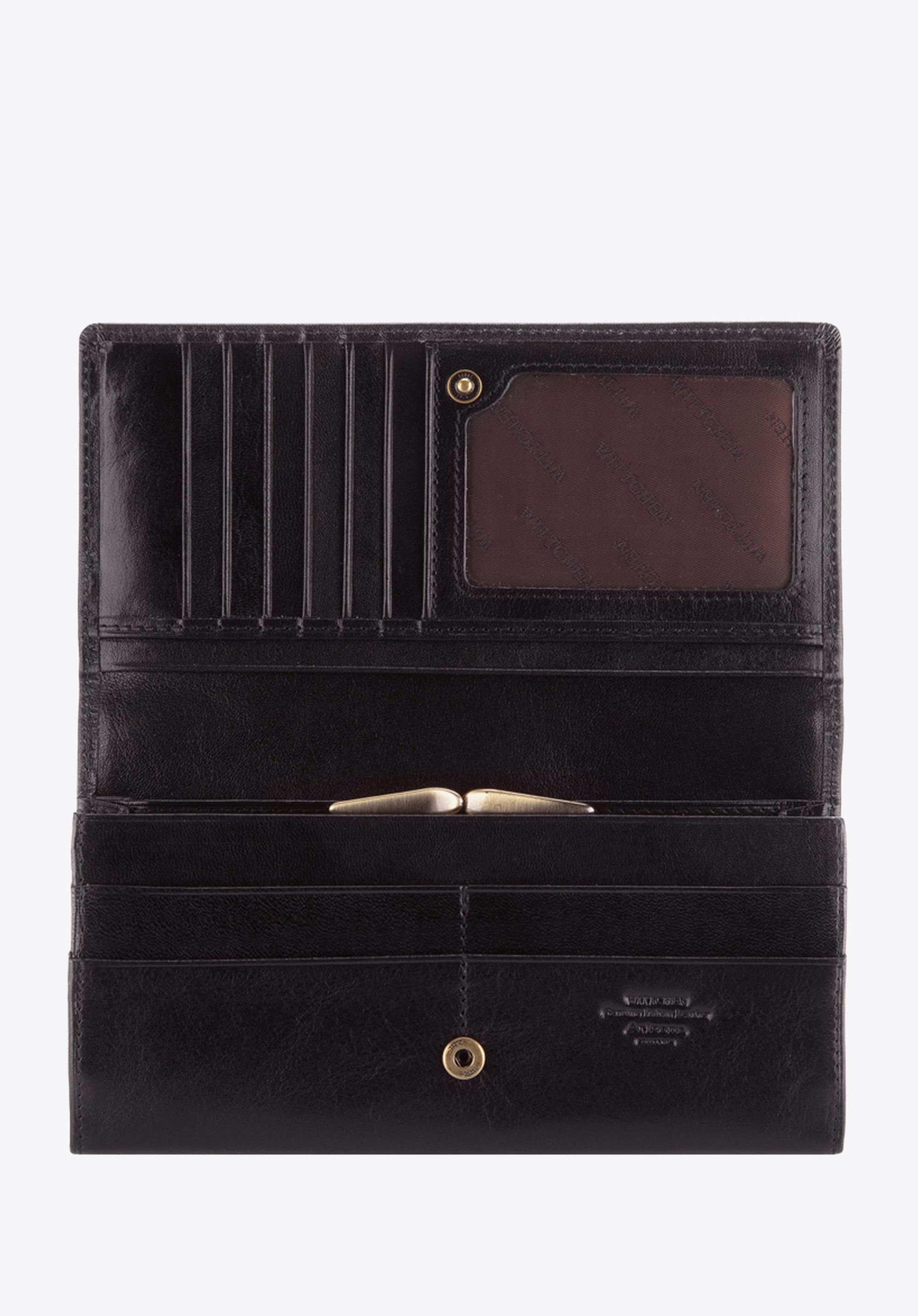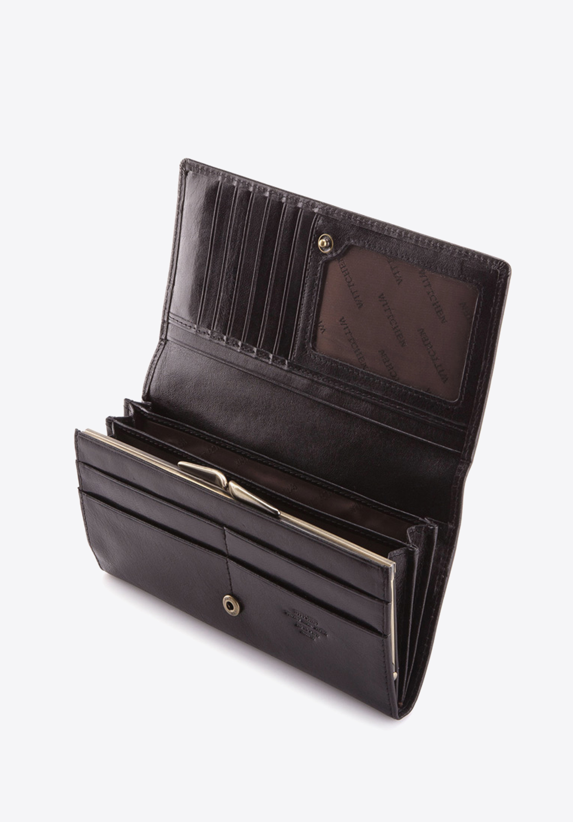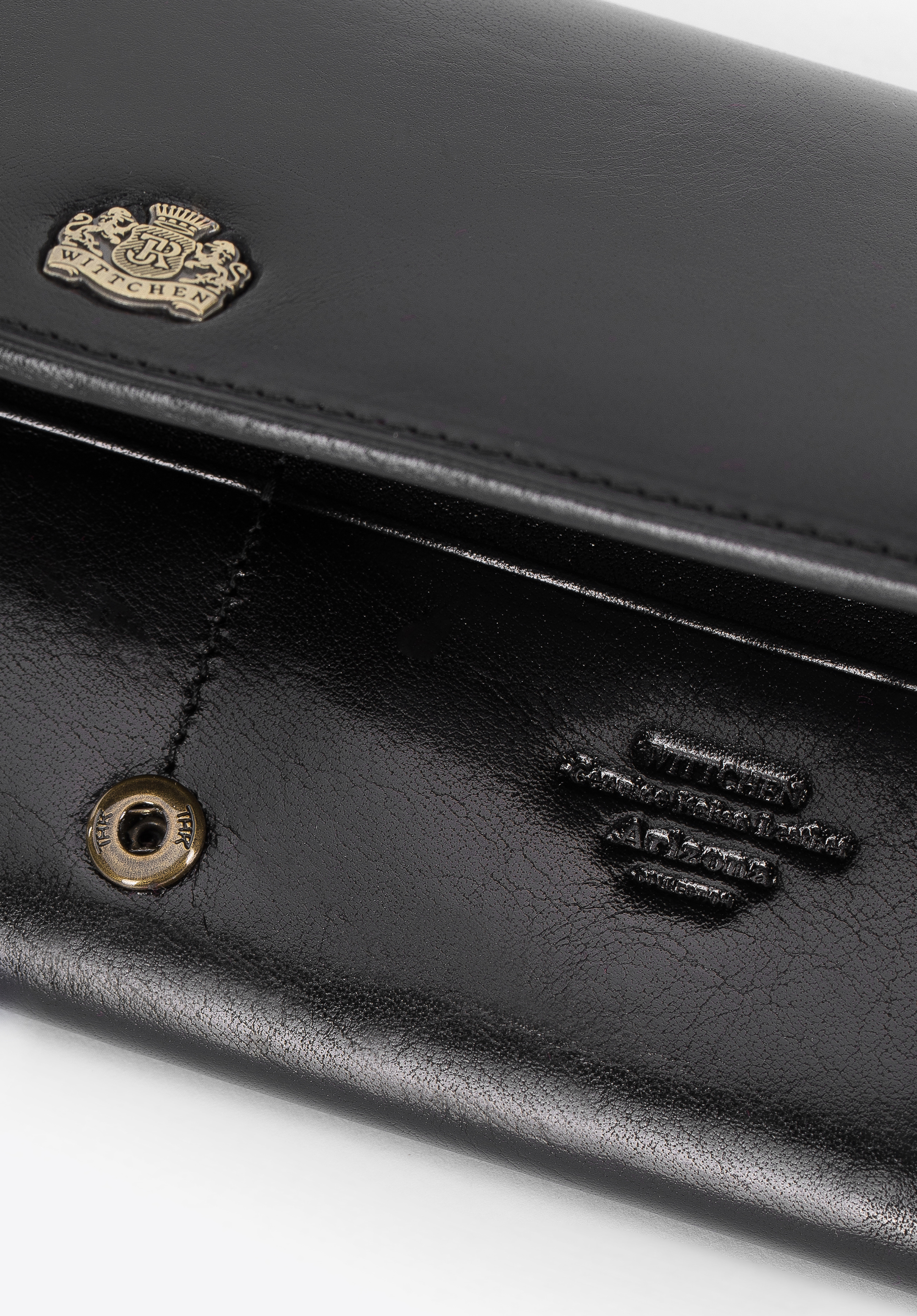 Великий жіночий гаманець красиво прикрашений гербом WITTCHEN кольору старого золота, виконаний з великою точністю. Ретельно оброблена теляча шкіра є гарантією високої якості і елегантного зовнішнього вигляду.