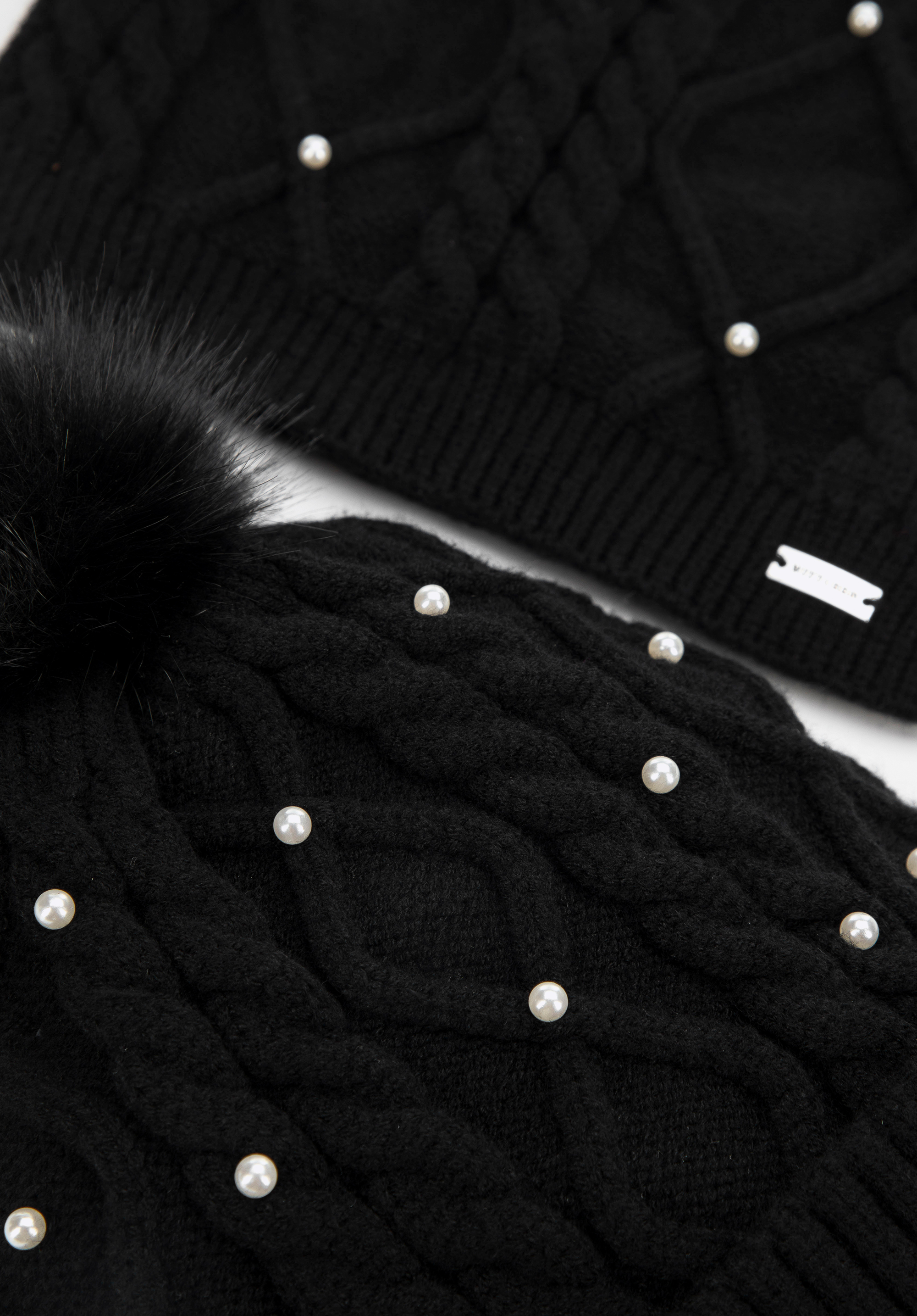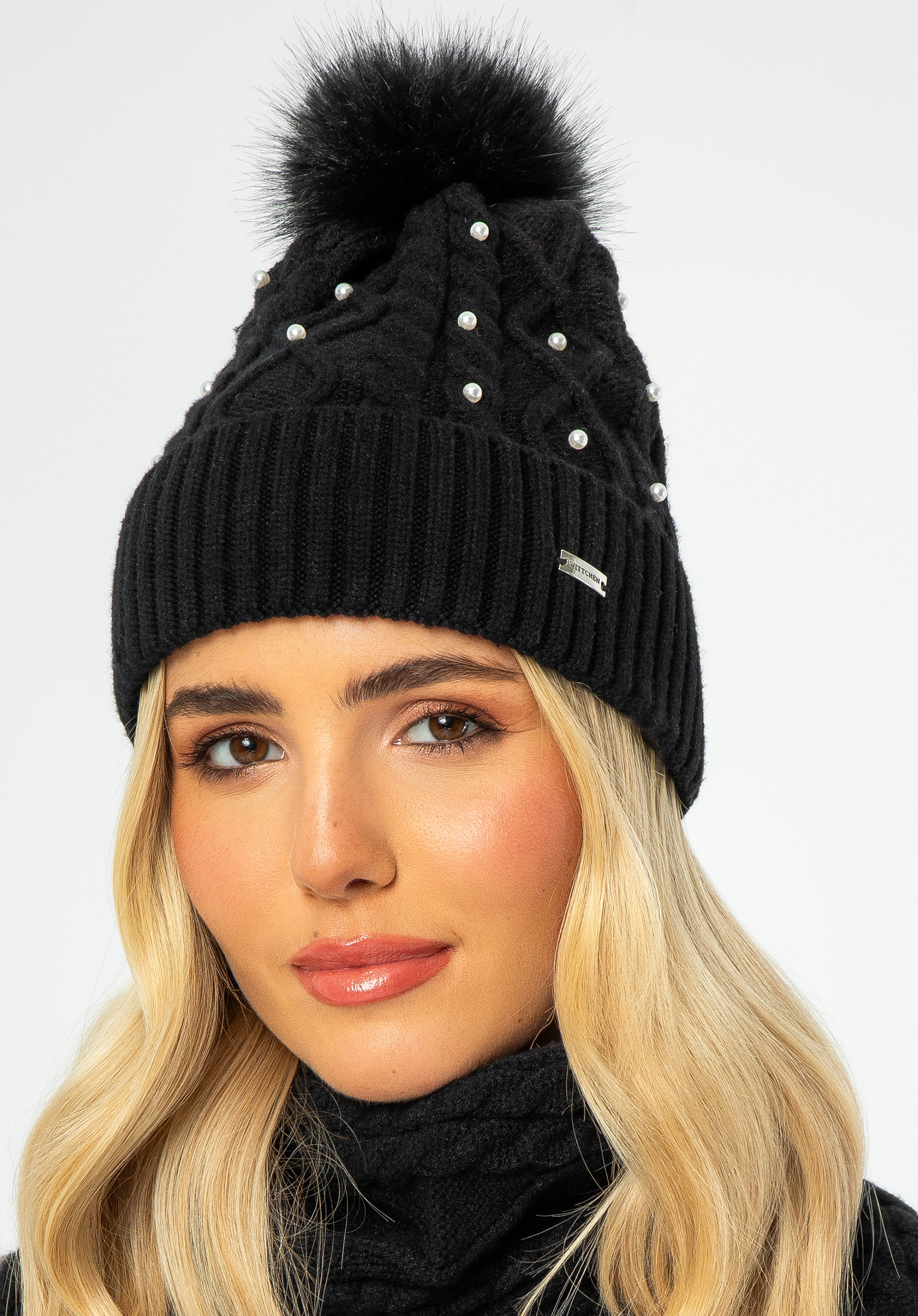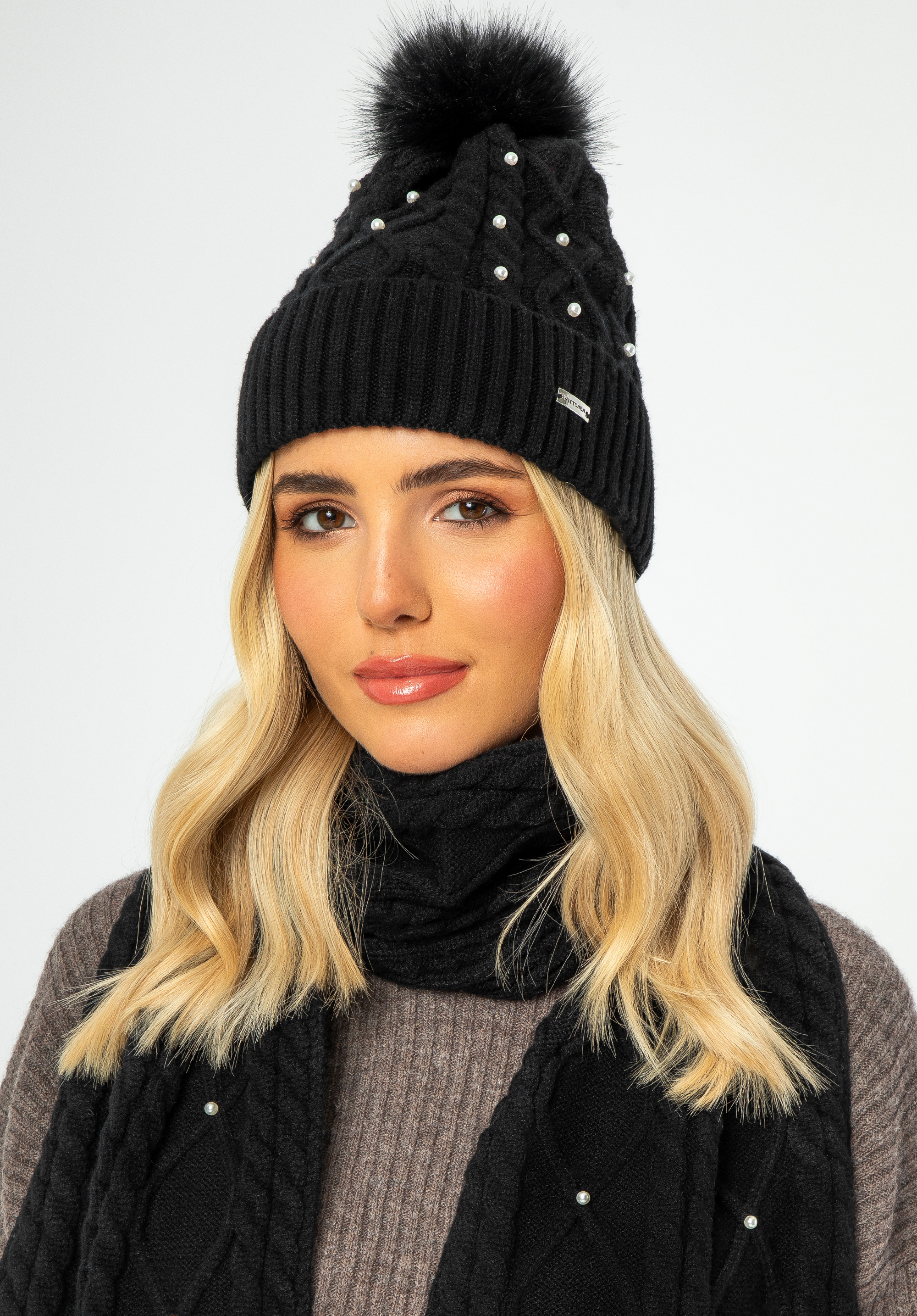 - Естетичні деталі: помпон на шапці додає елегантний акцент, який гармонує з класичним виглядом шарфа. Тонкі перлини на шапці додають блиск і нотку розкоші, доповнюючи елегантність всього комплекту.