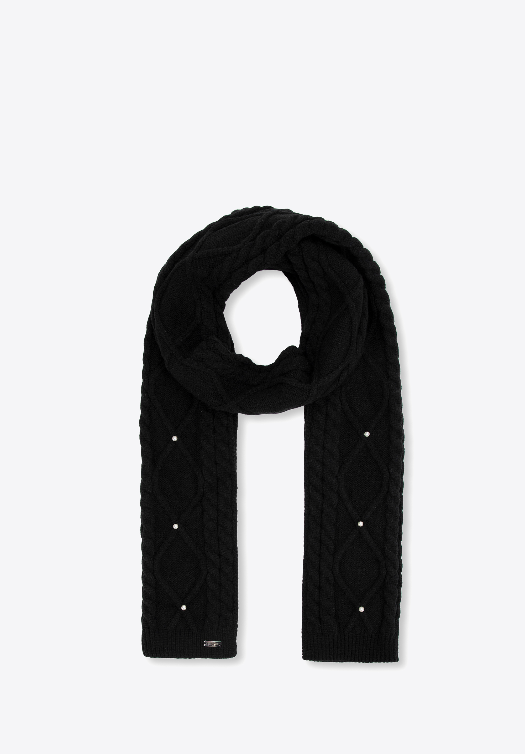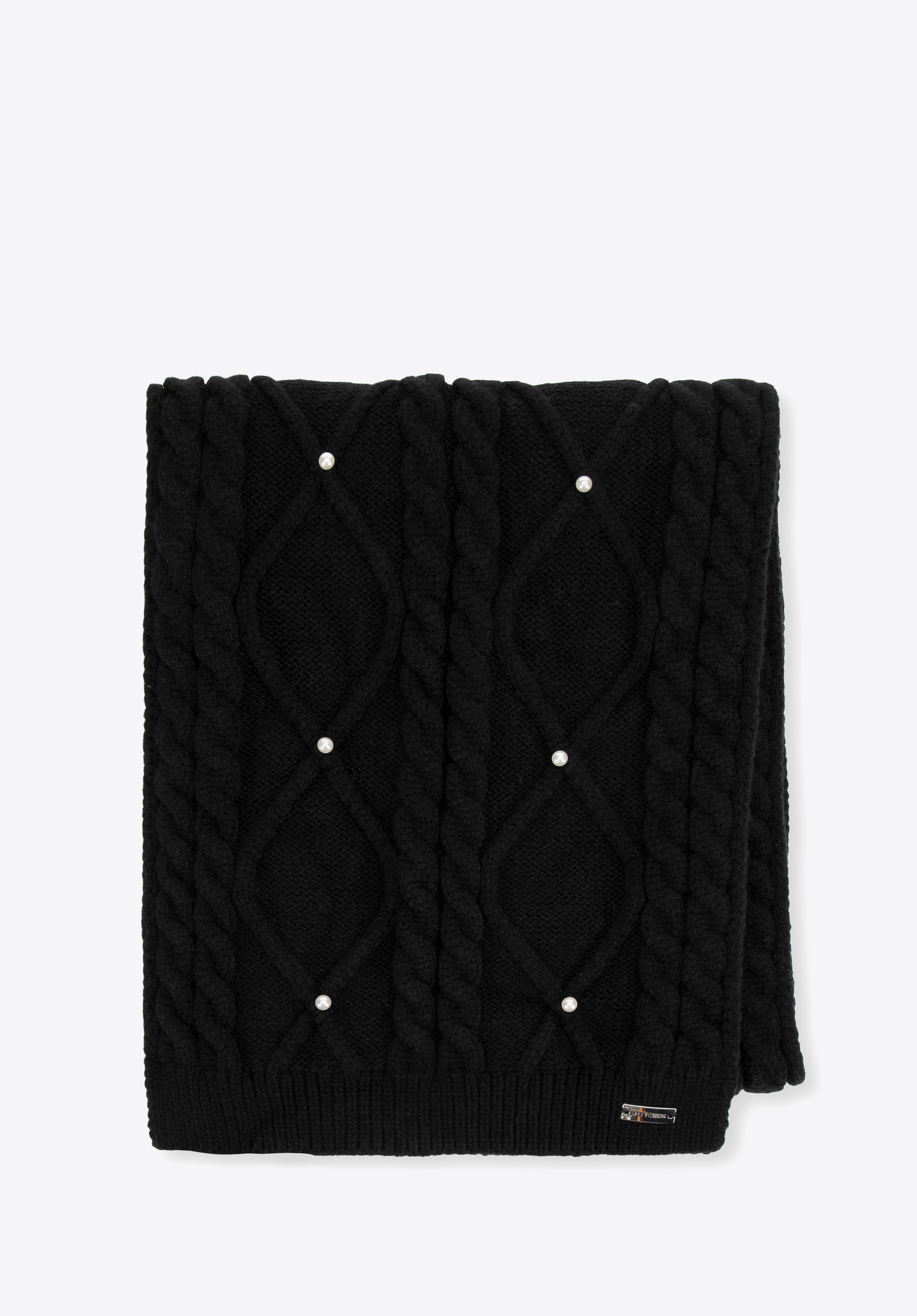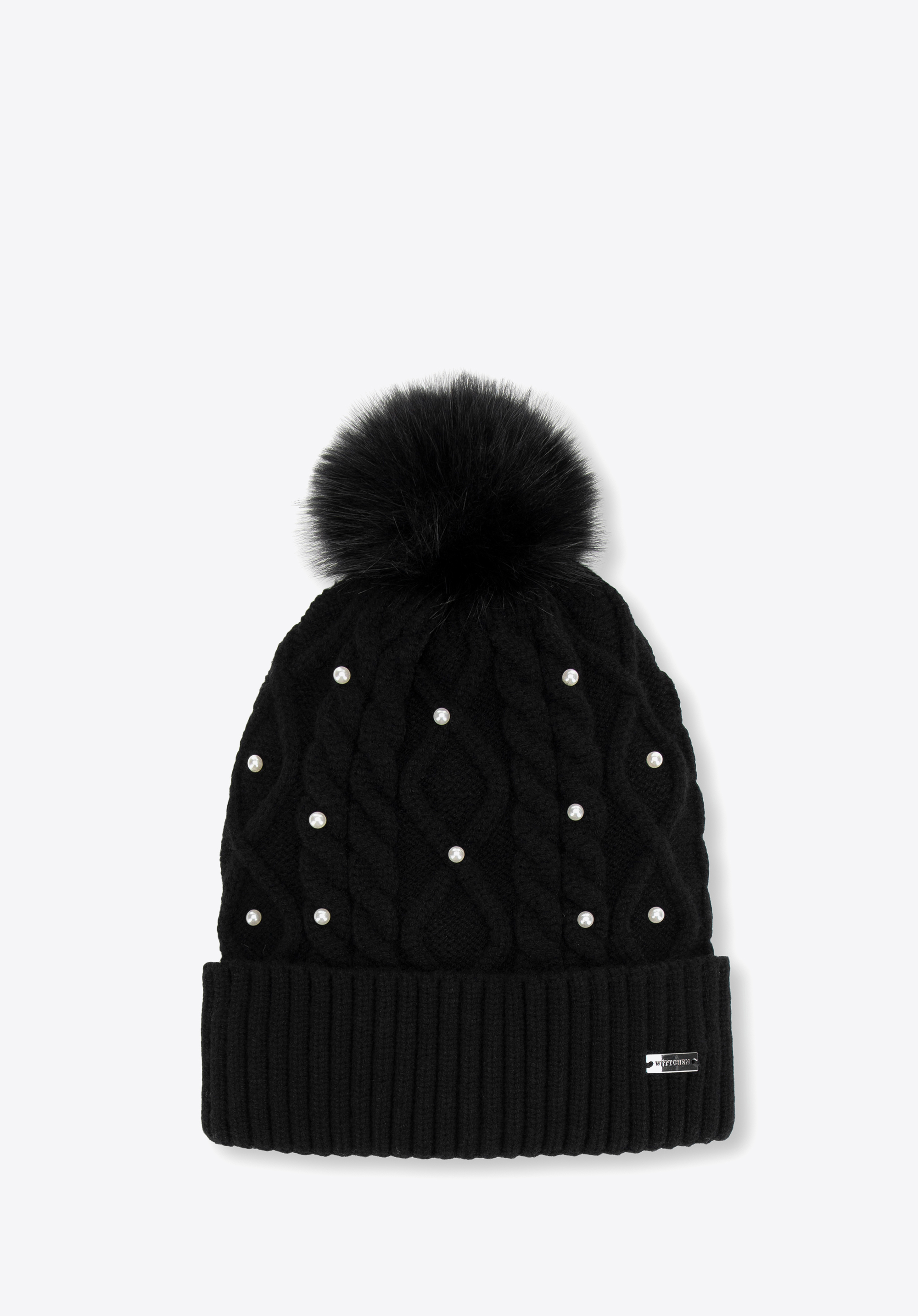 - Естетичні деталі: помпон на шапці додає елегантний акцент, який гармонує з класичним виглядом шарфа. Тонкі перлини на шапці додають блиск і нотку розкоші, доповнюючи елегантність всього комплекту.
