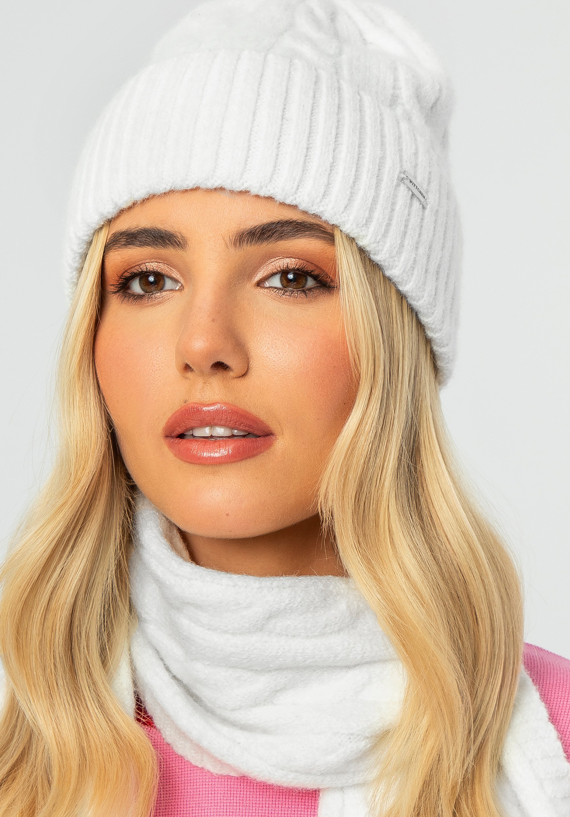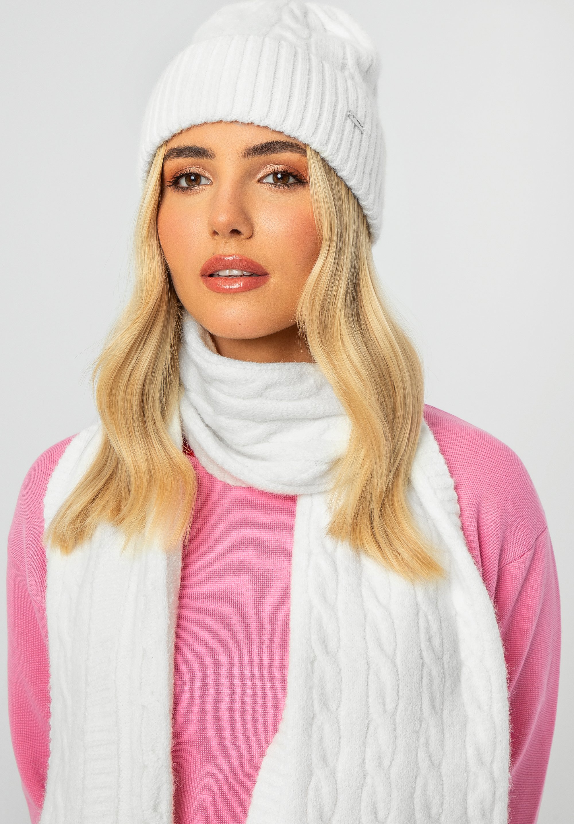 Жіночий зимовий комплект, що складається з шапки та шарфа, обов''язковий для холодних днів. Виготовлений із суміші поліестеру, акрилу та еластану, він поєднує в собі стиль, комфорт і функціональність. Еластична шапка з манжетою ідеально прилягає до форми голови, забезпечуючи тепло і комфорт. Делікатне плетіння коси надає комплекту класичний і сучасний характер, що робить його чудовим доповненням як до повсякденного, так і до елегантного стилю.